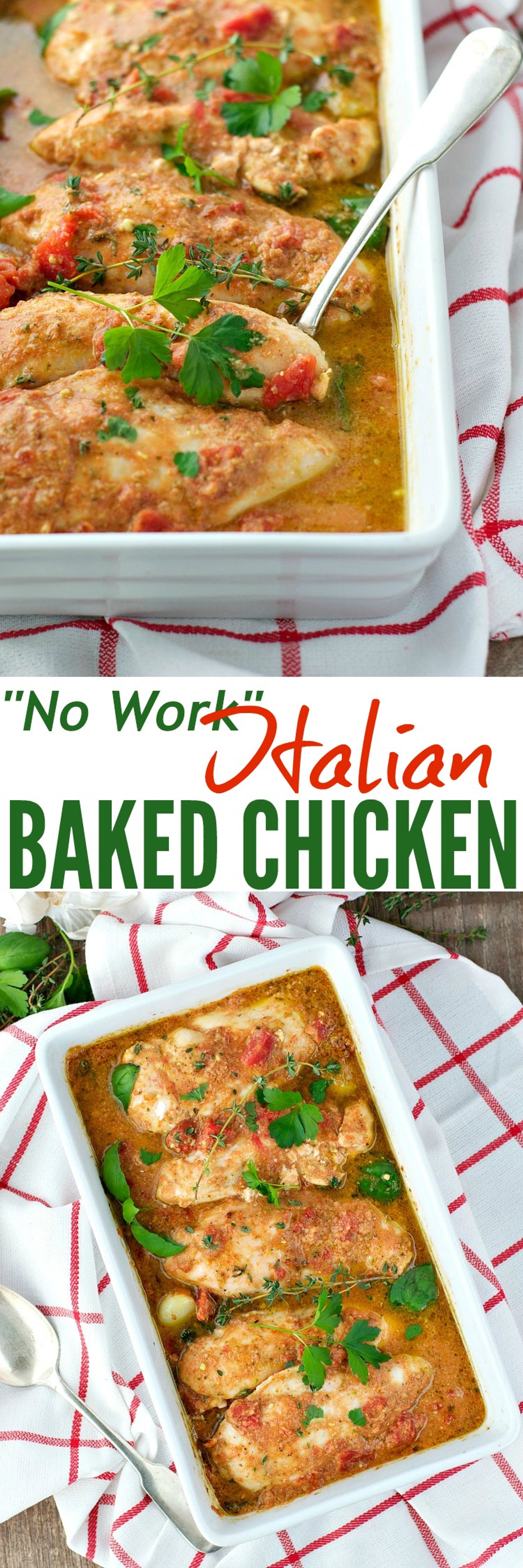 Roasted garlic, fresh herbs, and tomatoes create a delicious and simple pan sauce while this “No Work” Italian Baked Chicken cooks in the oven. It’s a fast, healthy, and easy weeknight dinner that your family will love!