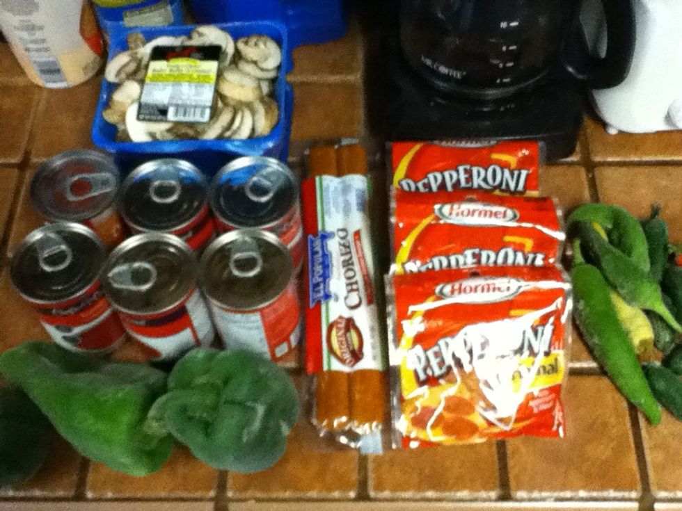 In a stock pot mix soup and water well. Add pepperoni and spices. Cover and simmer on medium/low heat, stirring occasionally to ensure no sticking. In a large skillet cook chorizo (remember to take this...