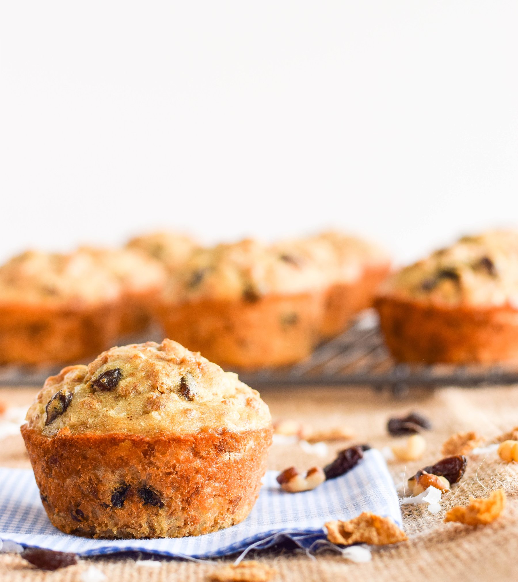 A bakery style bran muffin full of raisins, coconut, and chopped walnuts. These muffins are the perfect way to start your day. I love to make a big batch of muffins for Sunday morning breakfast and then eat the leftovers for a quick morning treat throughout the week.