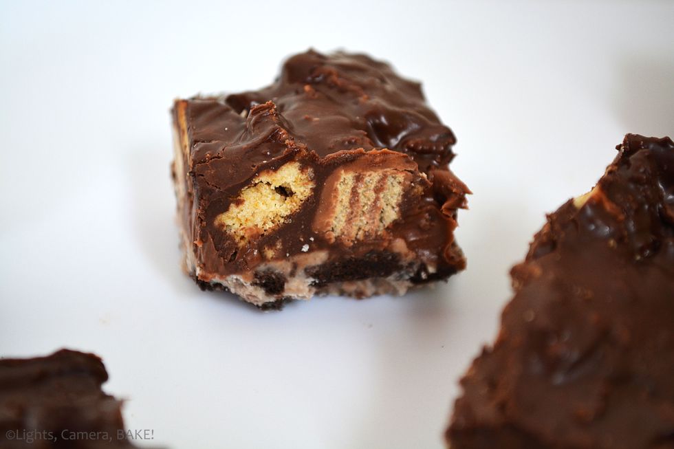 Layers of white chocolate mixed with crushed Oreos topped with chocolate mixed with crushed digestives with gooey Nutella and KitKats in the center.