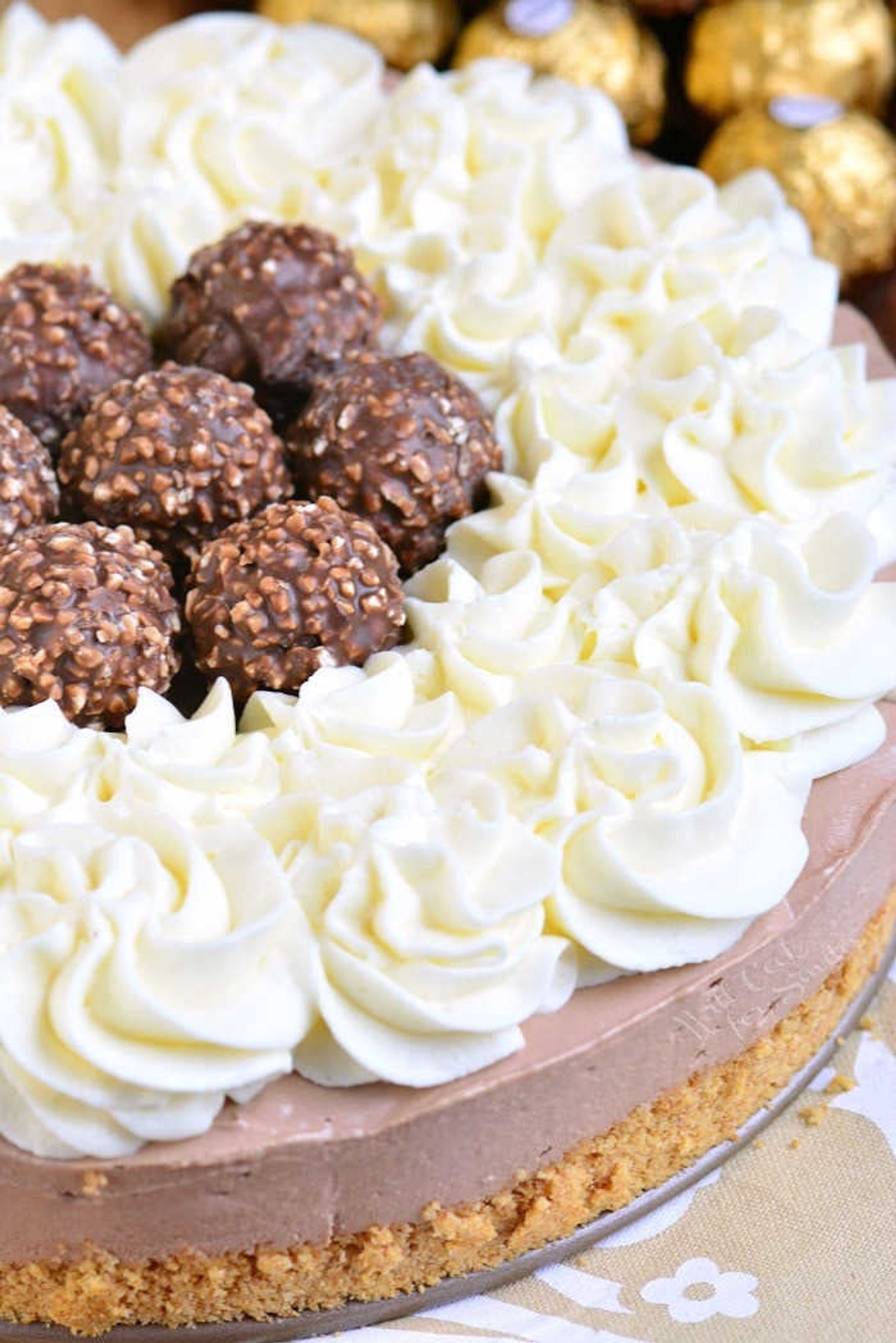 Silky smooth No Bake Cheesecake made with a layer of buttery graham cracker crust, silky Nutella cheesecake, and whipped cream cheese frosting on top.