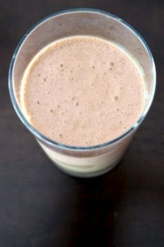 Add all of the ingredients to a blender and blend until smooth, adding enough milk until desired desired thickness is achieved.