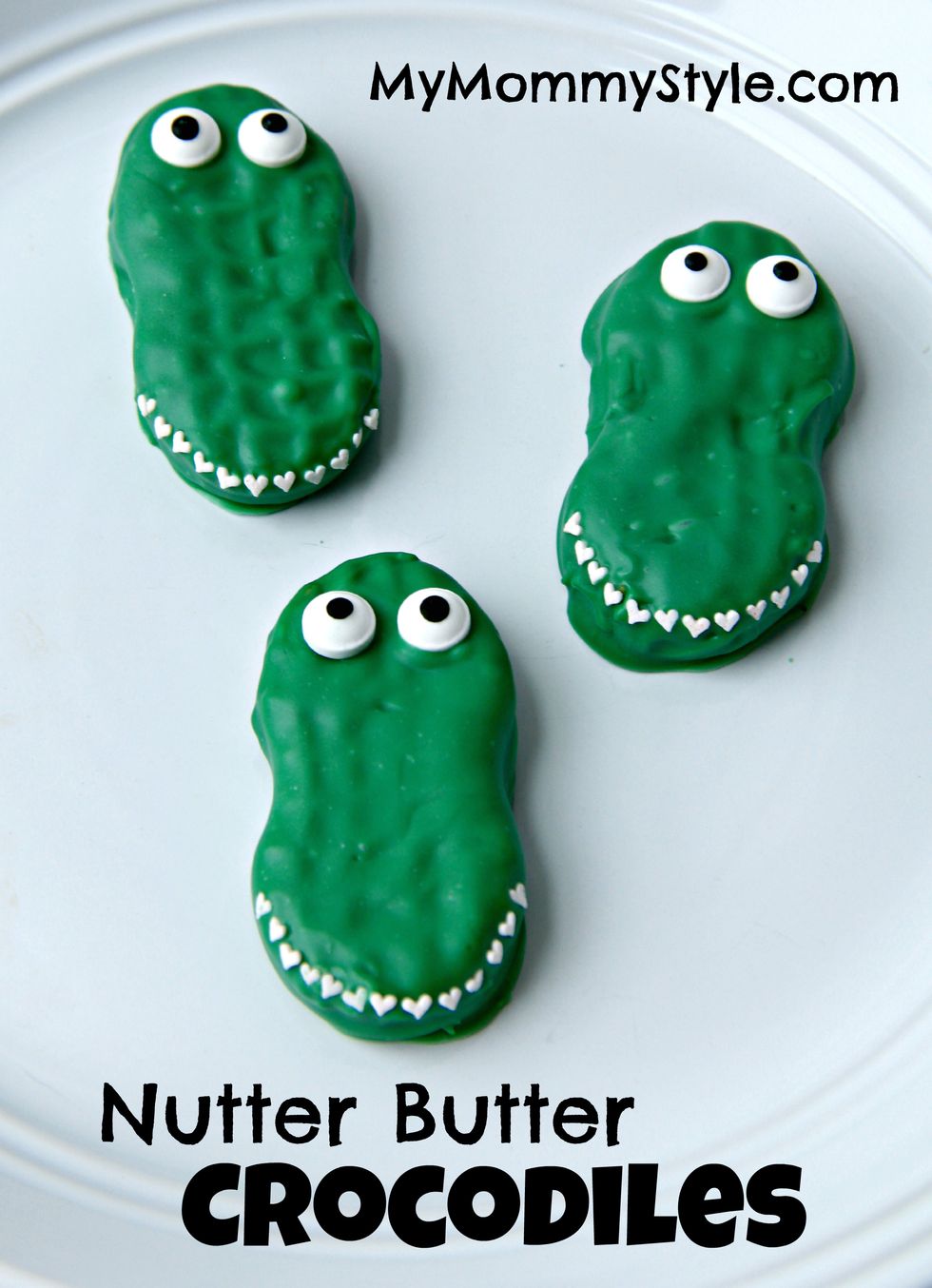 Adorable crocodile treats made from dipped Nutter Butters. It's an easy and adorable treat with no baking required!