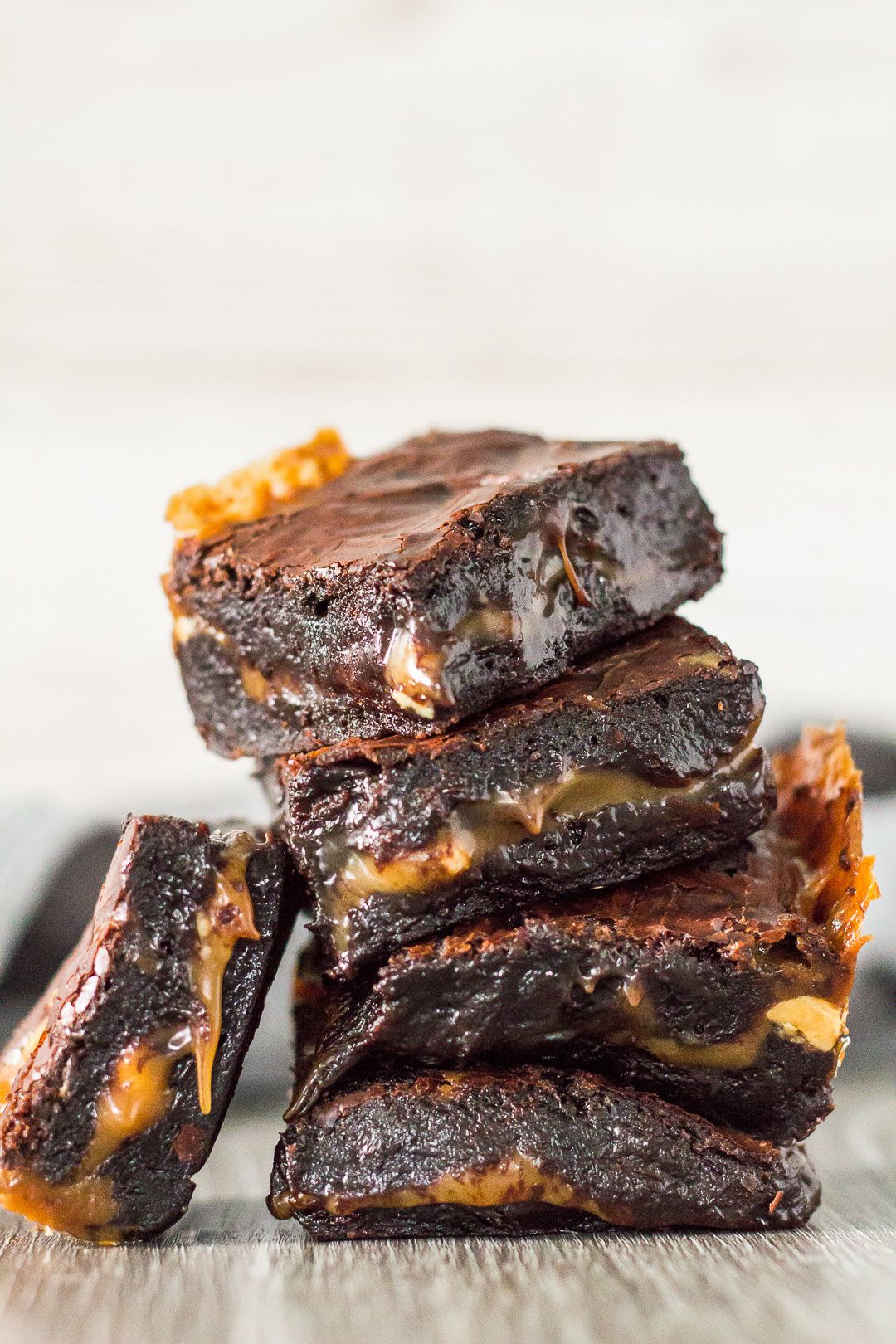 Deliciously thick and fudgy chocolate brownies filled with a caramel layer that is loaded with peanuts. Ooey gooey brownie goodness!