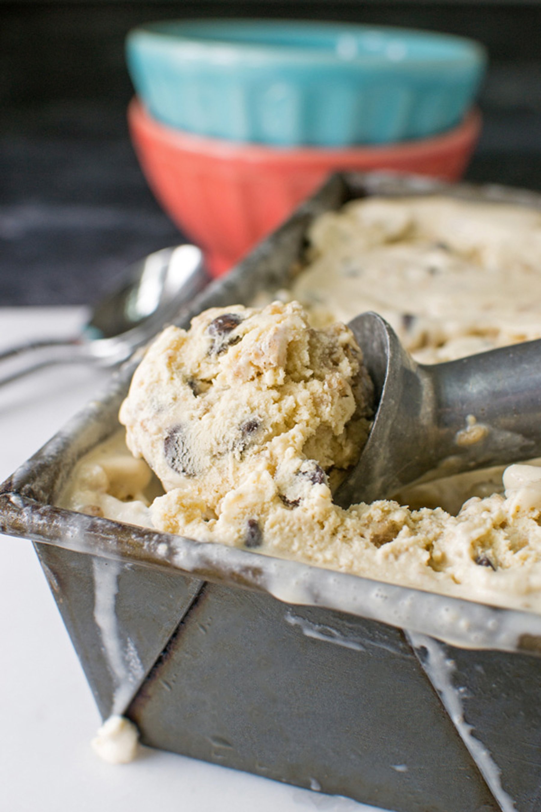 Brown sugar and cinnamon ice cream filled with chunks of oatmeal chocolate chip cookie dough.