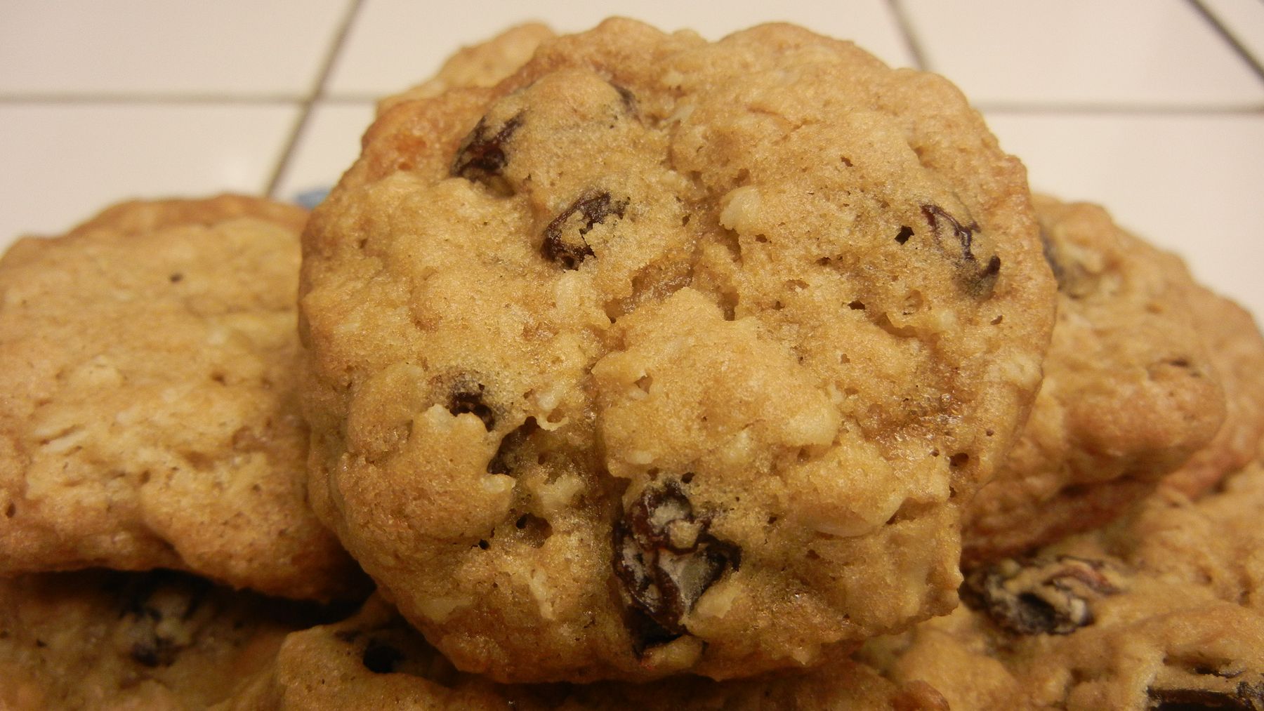 Cream together butter and sugars until light and fluffy. Beat in the egg and vanilla. In a separate bowl, combine the flour, oats, baking soda, salt, nutmeg, cinnamon, and raisins....