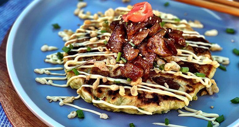 This delicious pancake is topped with tender Miyazakigyu Wagyu beef cubes, Kewpie mayonnaise, tenkasu tempera flakes, pickled ginger, and toasted sesame seeds. Okonomiyaki is a savory Japanese dish that isn't limited to breakfast. Try this recipe for your next dinner party!
