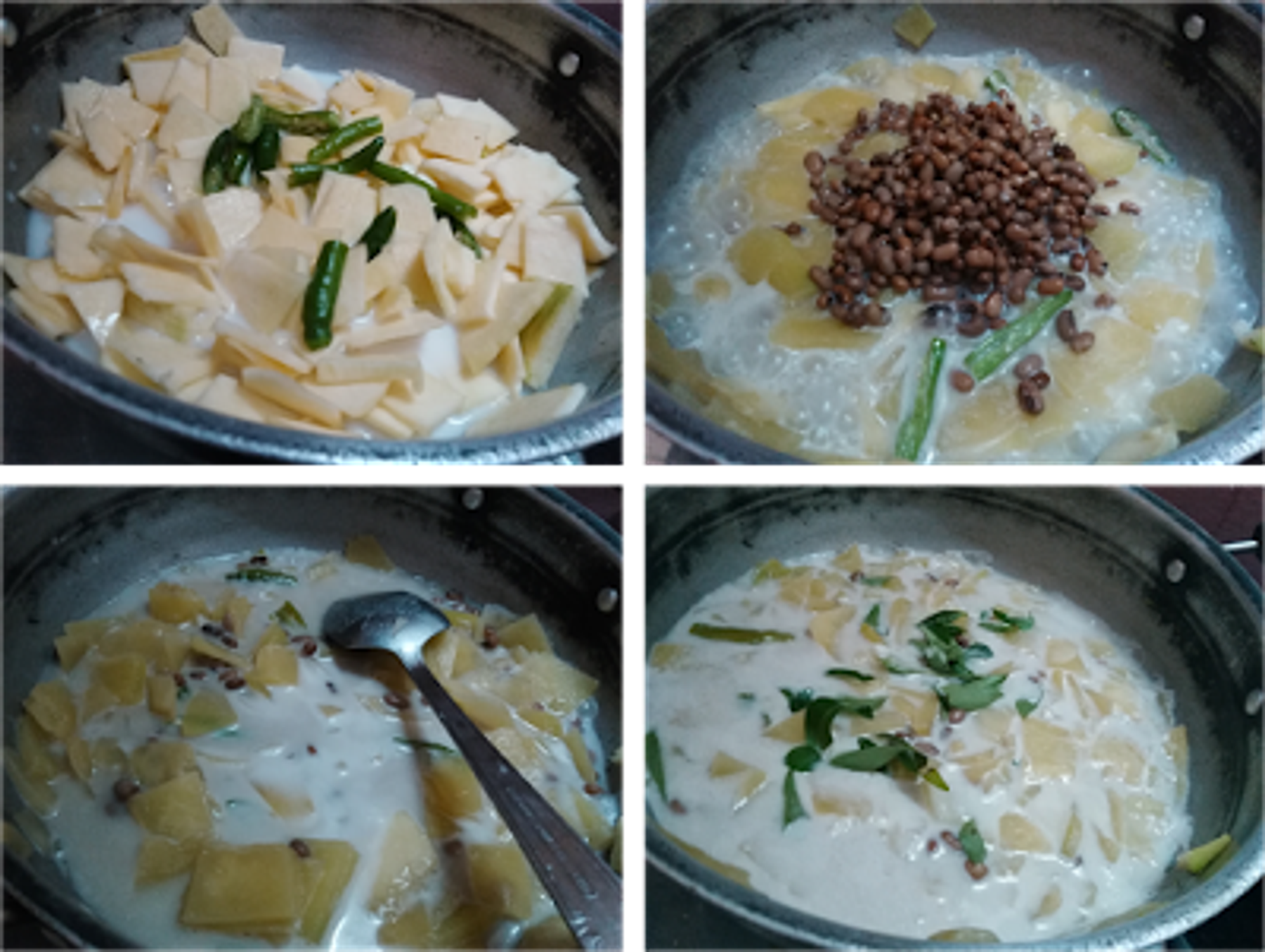 Boil the pumpkin pieces with thin coconut milk and slitted green...