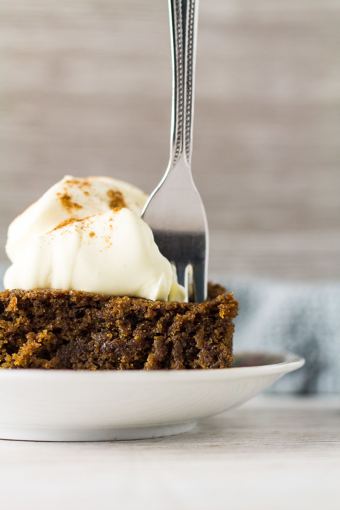 Deliciously moist gingerbread that is loaded with warm, comforting flavours and topped with a dollop of whipped cream. The BEST old-fashioned gingerbread!