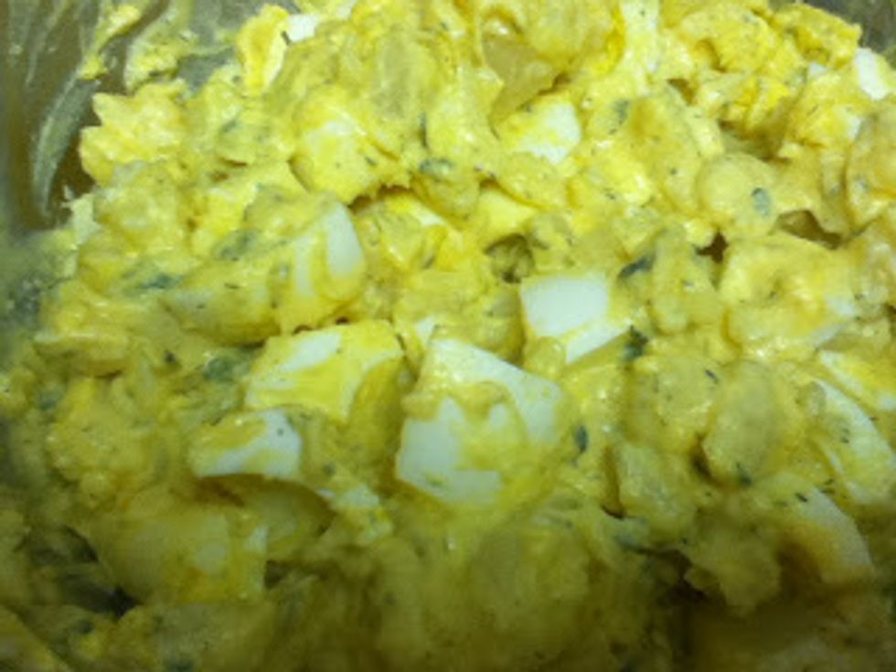 Boil potatoes until cooked, but not mushy, rinse and cool. Add eggs, onions, and celery. Mix gently. In a separate bowl mix the remaining ingredients. Add to the potato mixture. Refrigerate 2-4 hours. Serve cold.