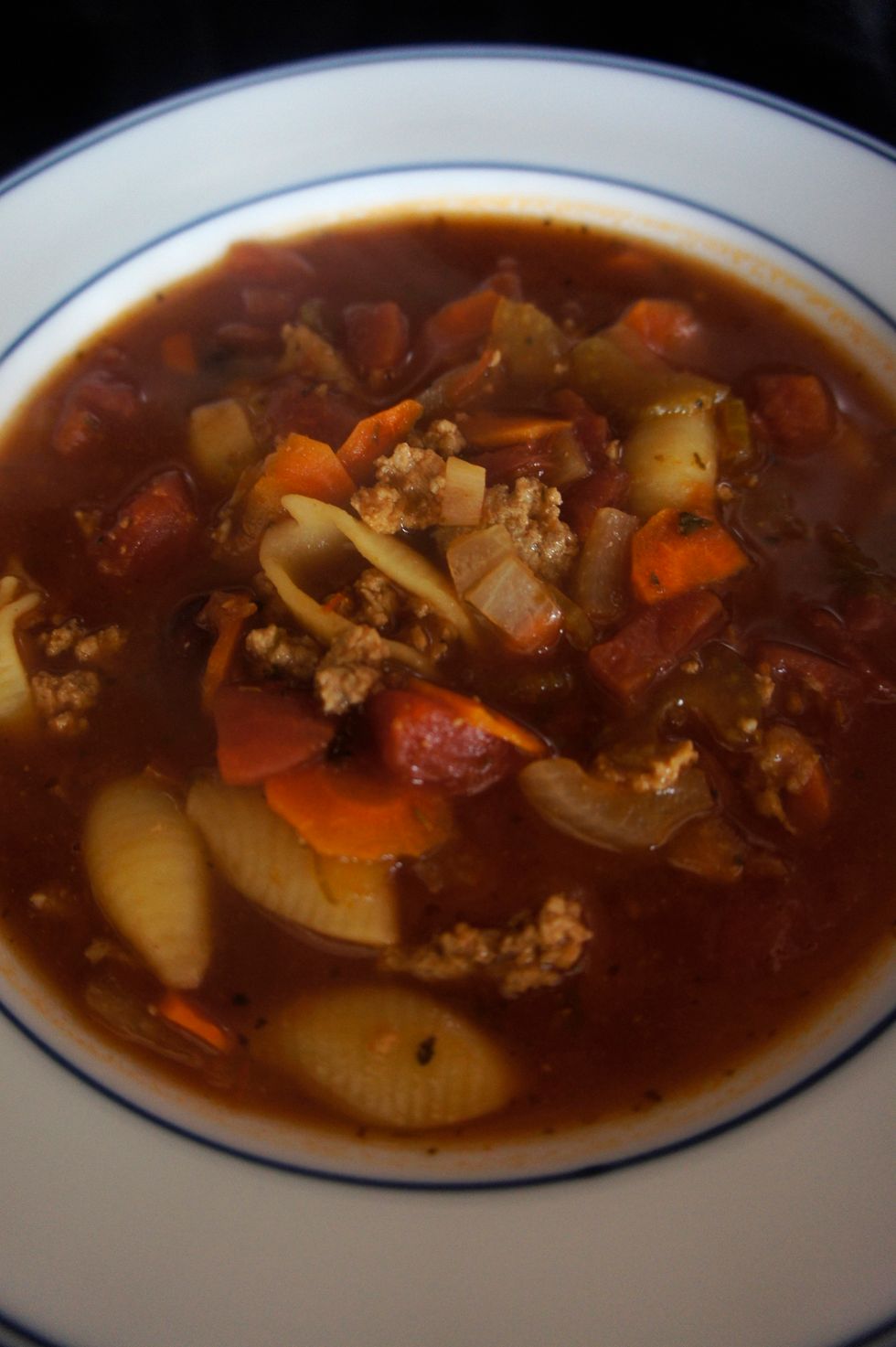 In a large stockpot add the olive oil and heat over medium-high heat. Add in the ground turkey and cook until it starts to brown. Add in the onions, carrots, celery, diced tomatoes and simmer for 10...