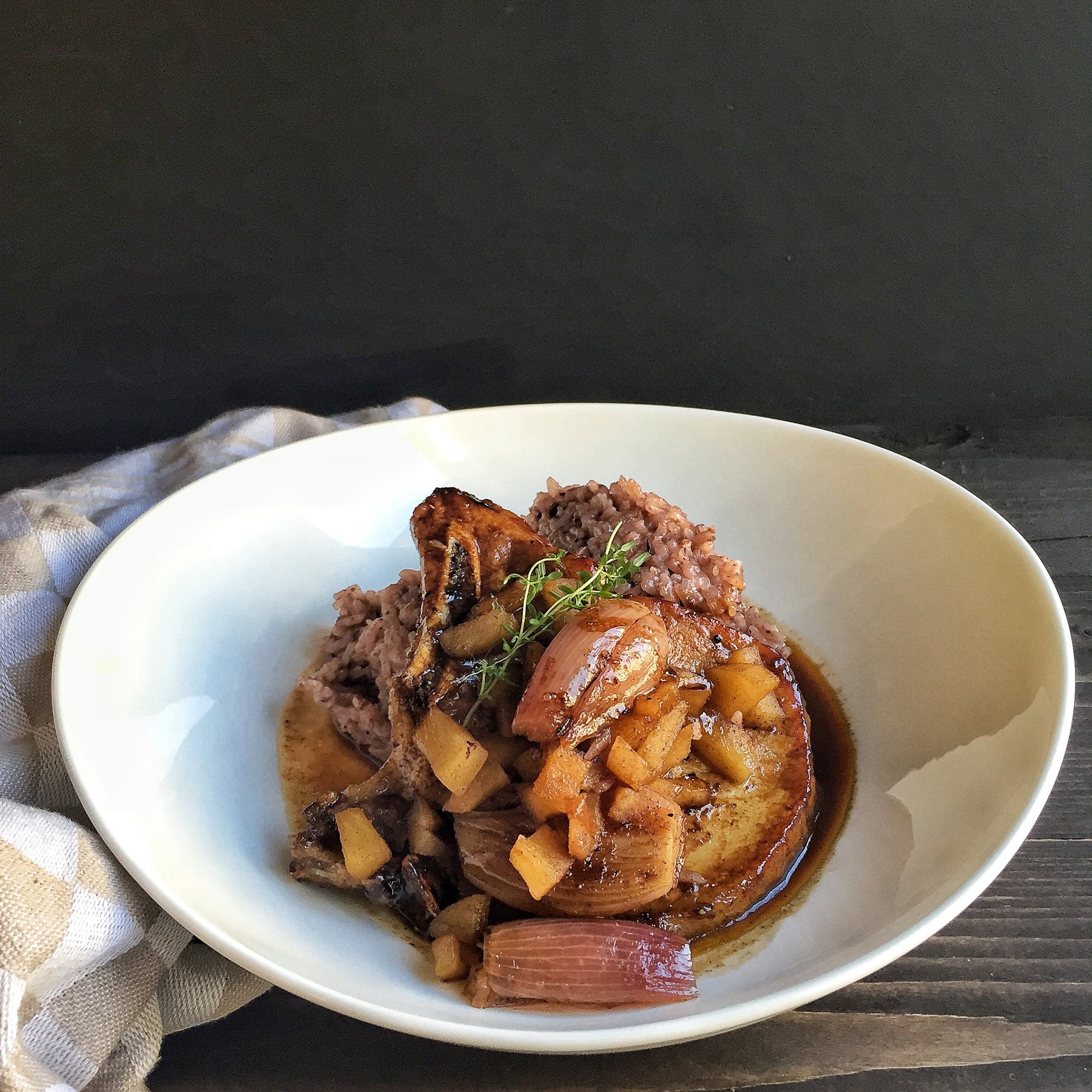 Olive Rice with Balsamic Pork Chops, Apples & Shallots