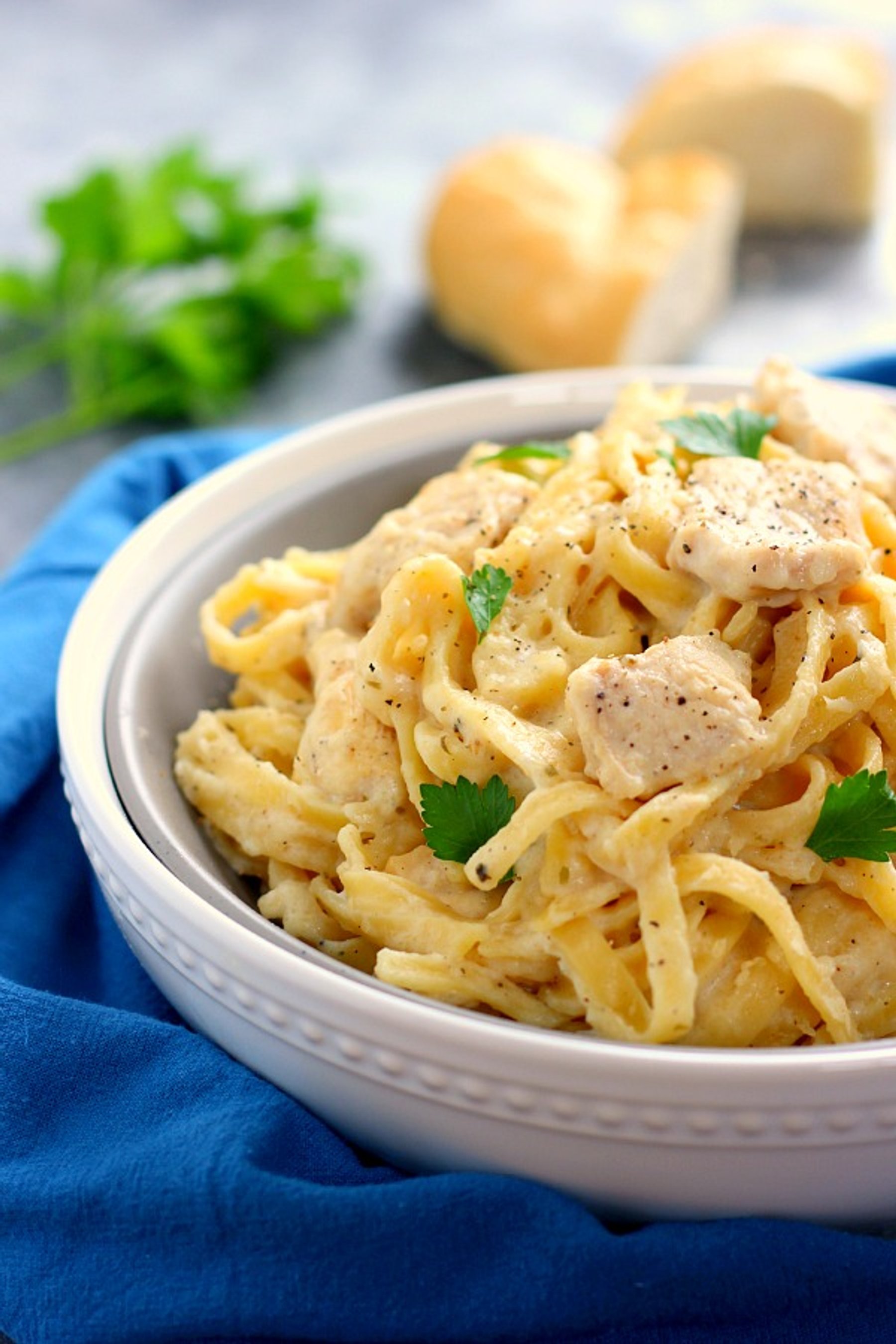 This One Pan Chicken Fettuccine Alfredo is filled with tender chicken and fresh pasta that’s tossed in a lightened, creamy sauce!