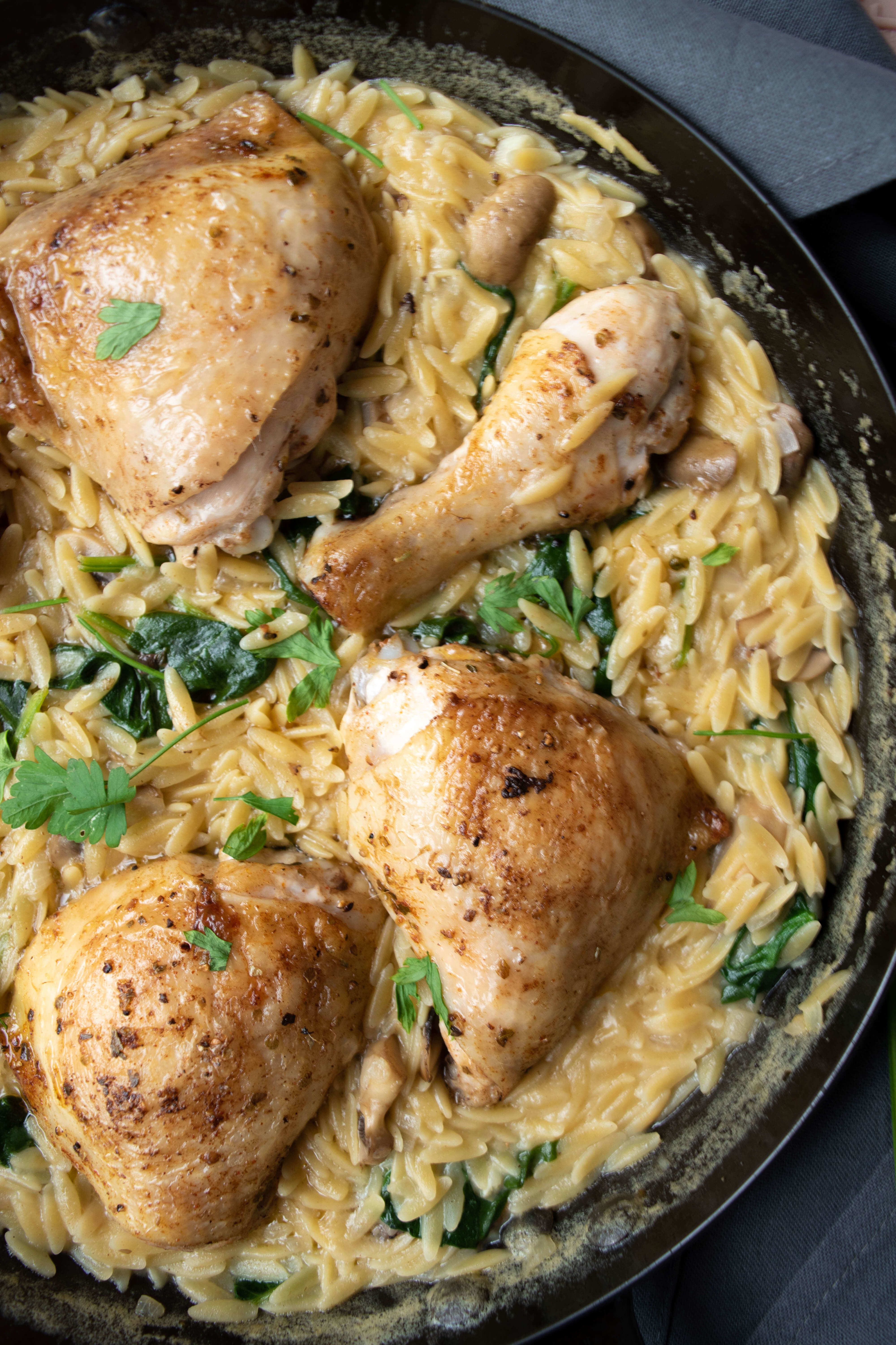 This One Pan Chicken & Orzo is super creamy and easy to make. Orzo takes the place of the arborio rice in a creamy risoto style dish with mushrooms, spinach and crispy seared chicken. And it all comes together under 30 minutes.