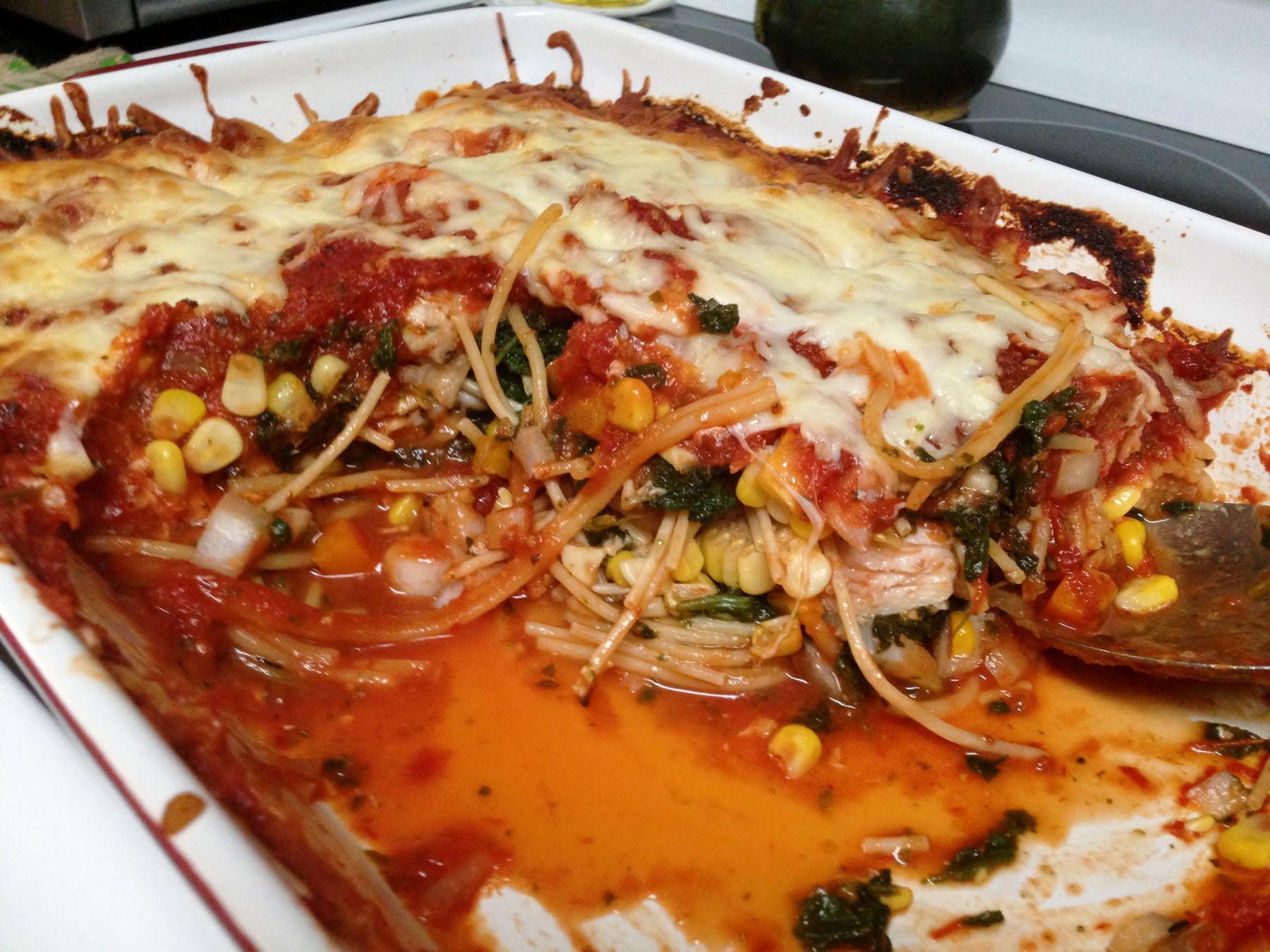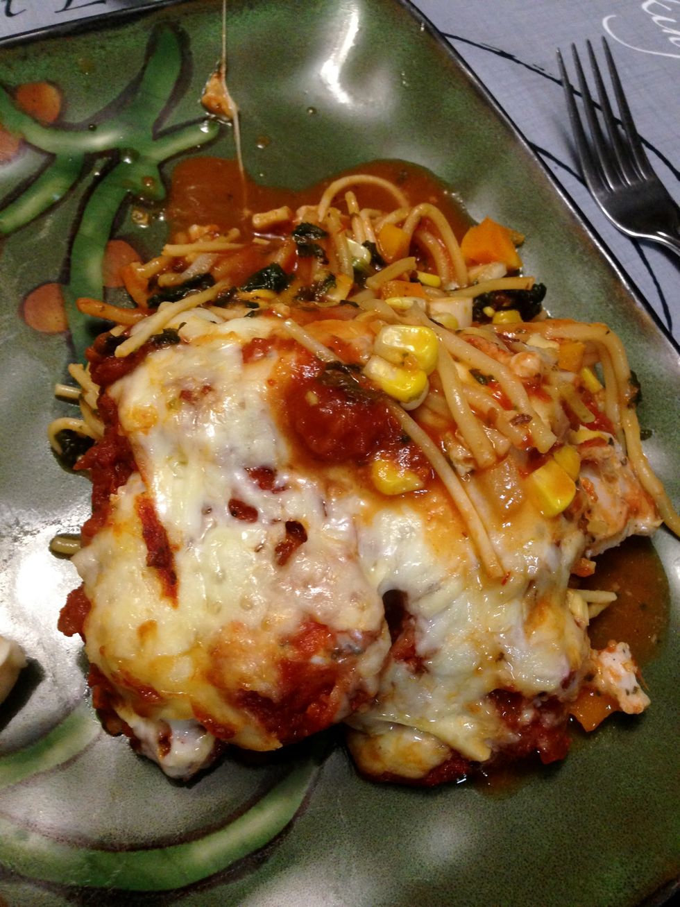 Preheat your oven to 350. Season the diced chicken with the oregano, basil, salt and pepper. Pour about half of a jar of marinara in the bottom of a 9×13 baking dish. Layer half of the spaghetti along...
