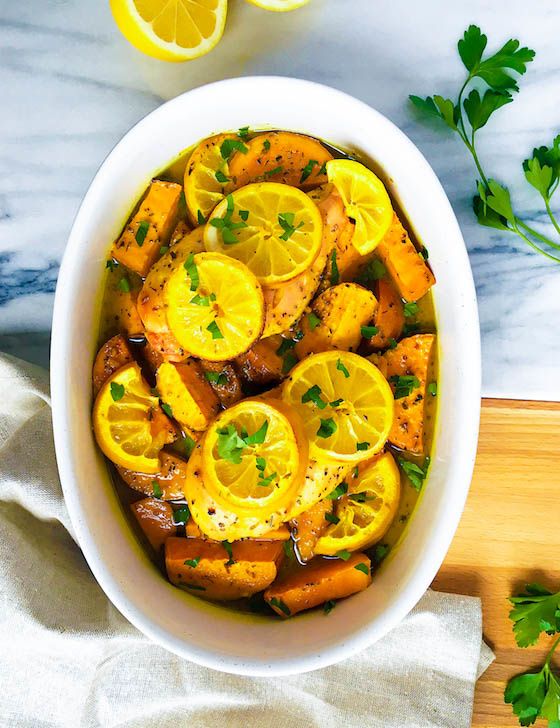 One Pan Lemon Chicken with Sweet Potatoes