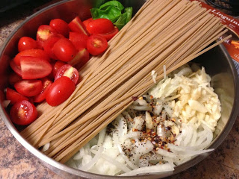 One Pan Pasta - Whole Wheat Linguine with Tomatoes, Basil, Garlic and Onions