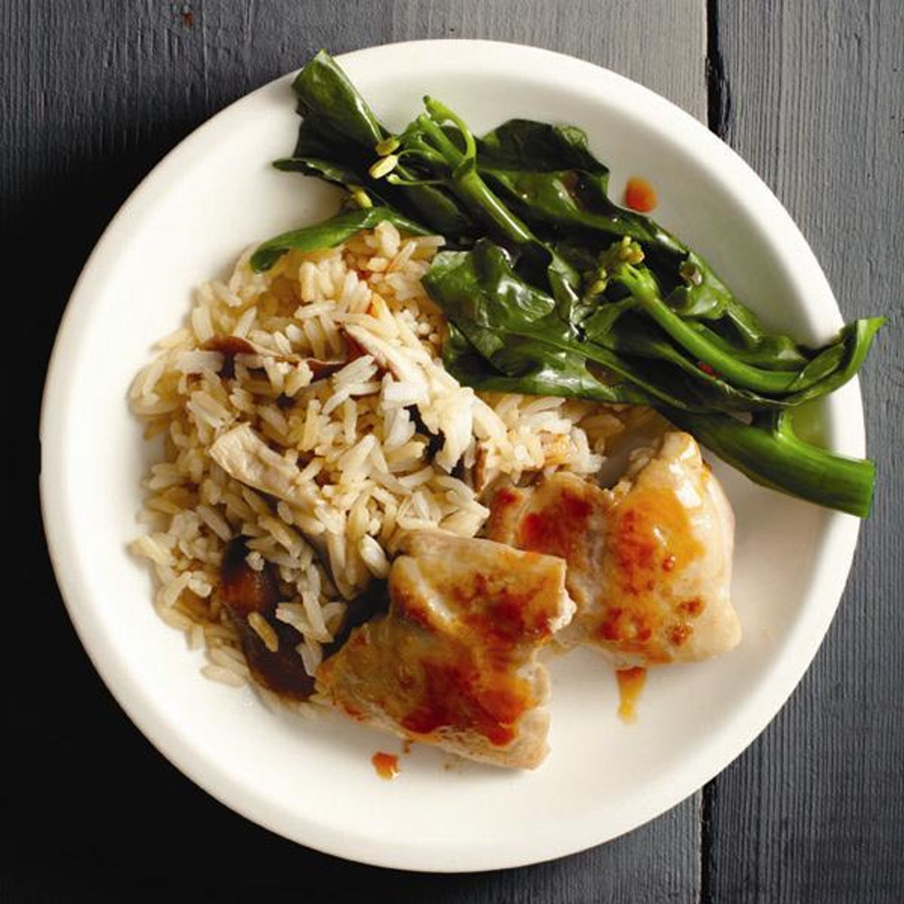 Remove lid. Lay greens over chicken and rice. Cover and continue simmering until greens are just tender, about 5 more min. Drizzle sesame oil over finished dish before serving.