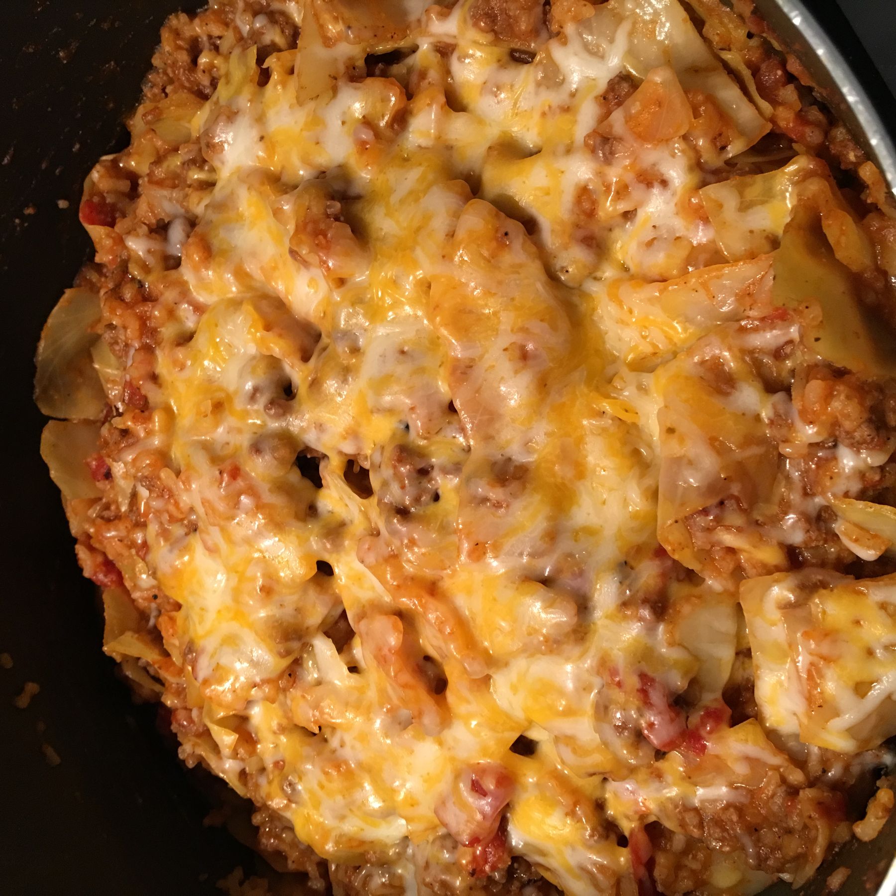 Once onions are clear, add rice, cabbage, tomato sauce, 2 cups of water (or use tomato sauce cans) and diced tomatoes. Stir.