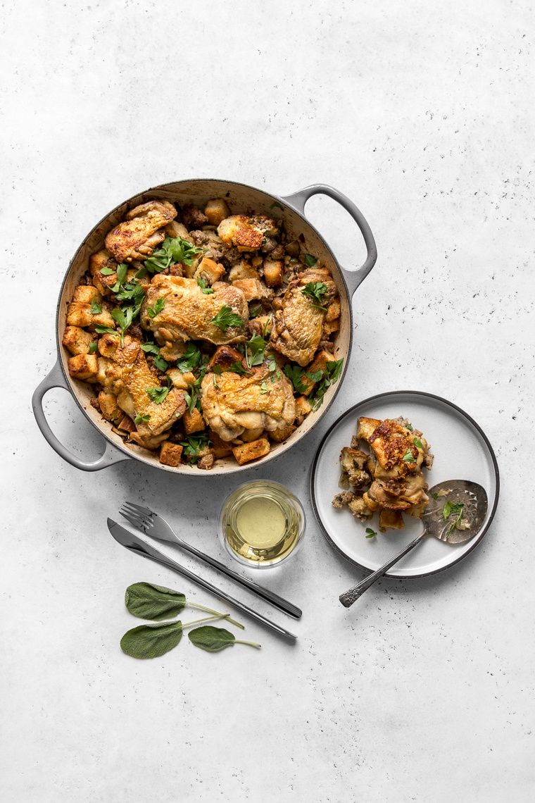 A take on traditional stuffed chicken, our One Pot Chicken and Stuffing with Sausage is crisp, moist and the perfect holiday dish for those times you don't want to prepare a full on holiday meal.