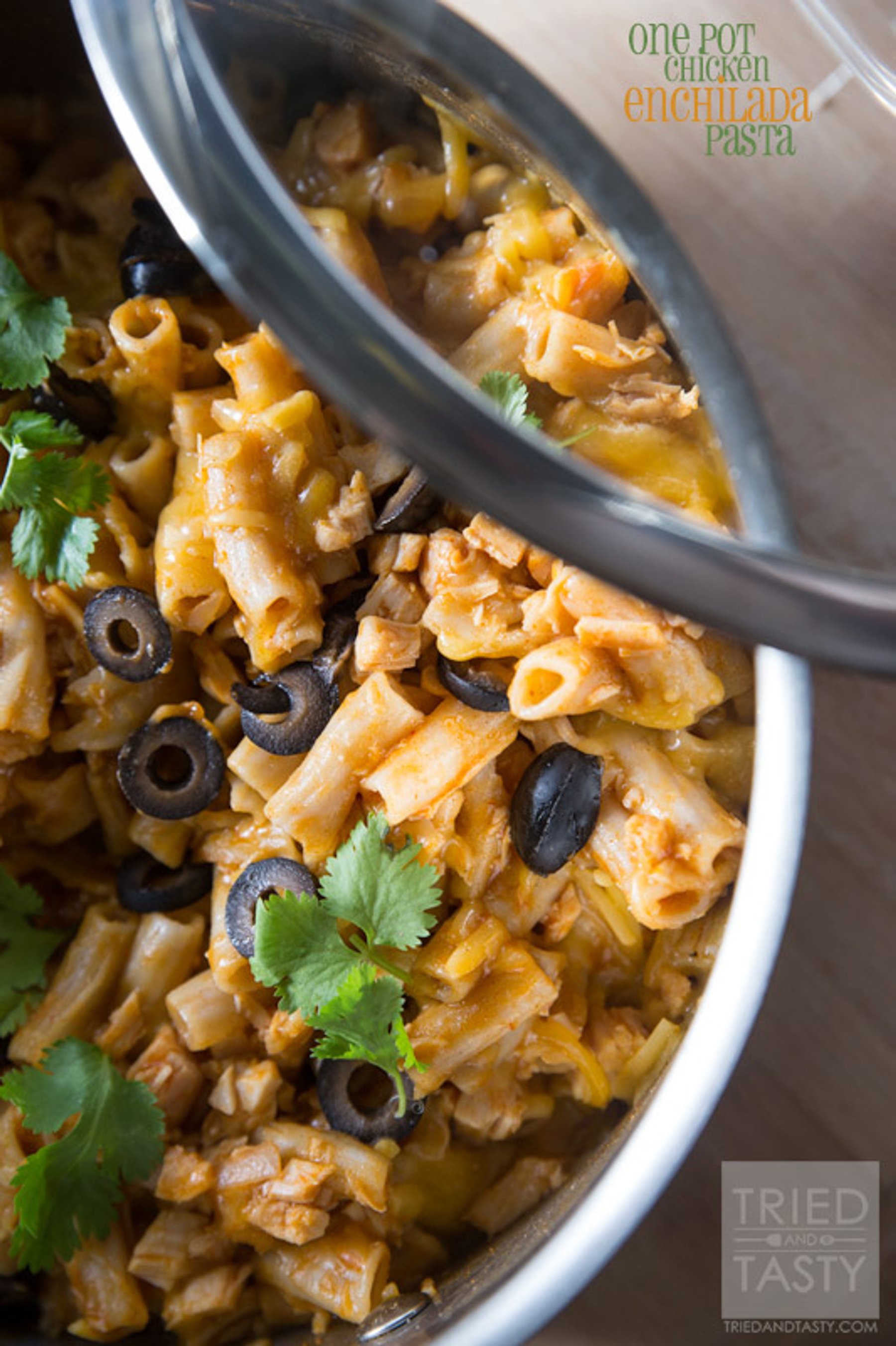 In a large 5 qt. casserole pot, sauté garlic and onions in olive oil over medium low heat until softened. Add chicken and taco seasoning; stir to coat evenly. Add pasta, chicken broth and enchilada sauce to...