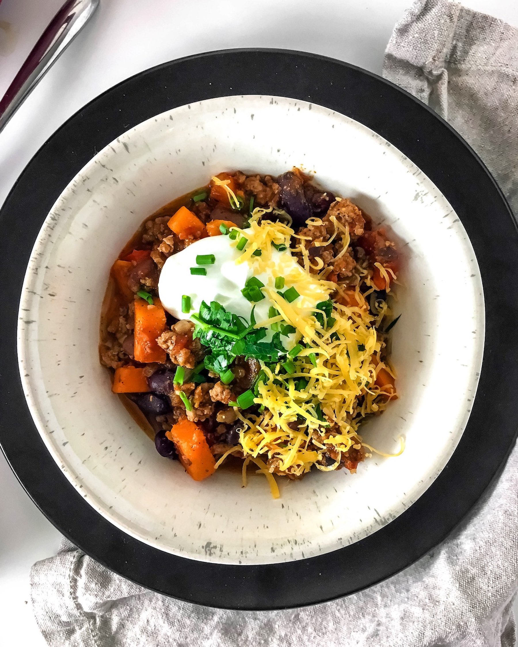The tastiest and easiest turkey + sweet potato chili made in one pot.