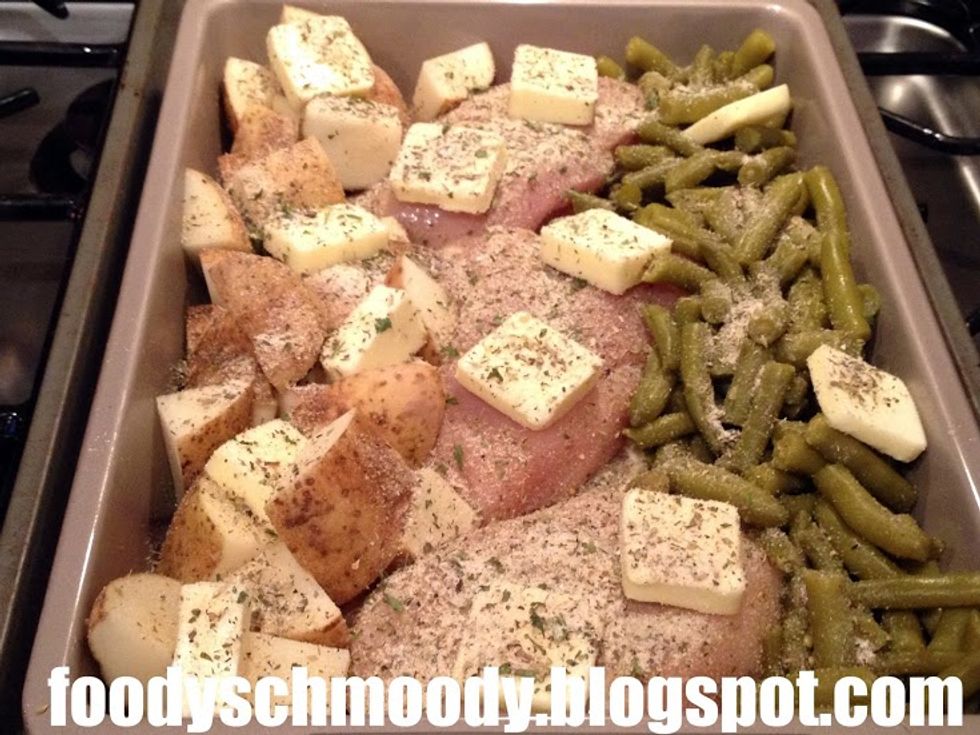 A one pot meal that takes under 5 minutes to prep- yes please! Oh and tastes delicious to boot! This recipe will quickly become a staple in your home. I'm not sure which part is better, that it takes 5 minutes to prep or that there is virtually no clean up because it's all in one pan! Now before you get your panties in a ruffle over the amount of butter in this recipe, you could easily cut it in half, but now why would you want to??