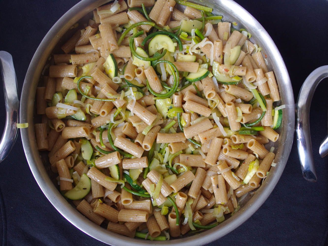 One Pot Pasta with Zucchini, Garlic Scapes, and Leeks in a White Wine Lemon Sauce