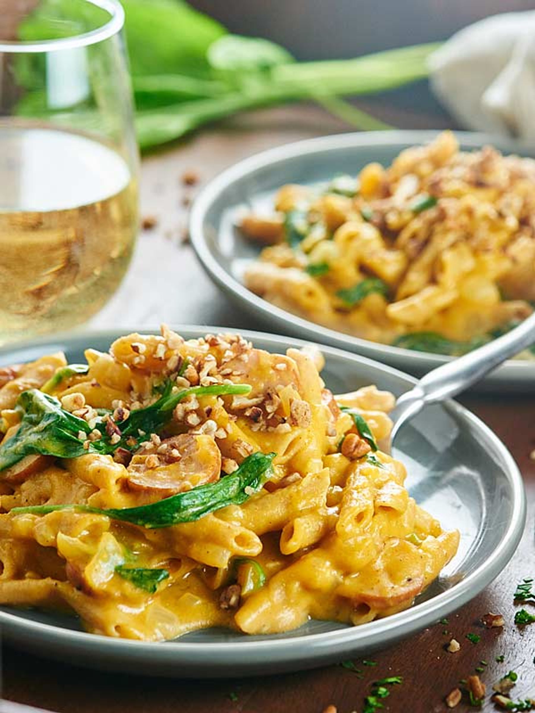 One Pot Pumpkin Pasta - only dirties one dish & is full of healthy, delicious ingredients like whole wheat pasta, spinach, & apple chicken sausage!