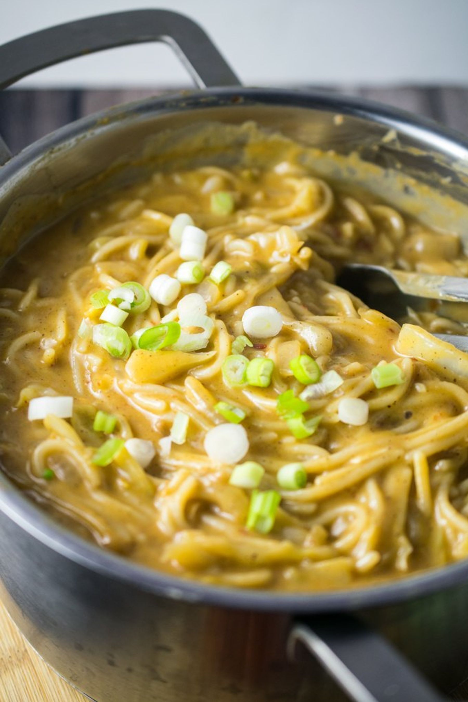 Spicy garlic almond butter sauce noodles, all cooked together in one pan for easy cleanup!