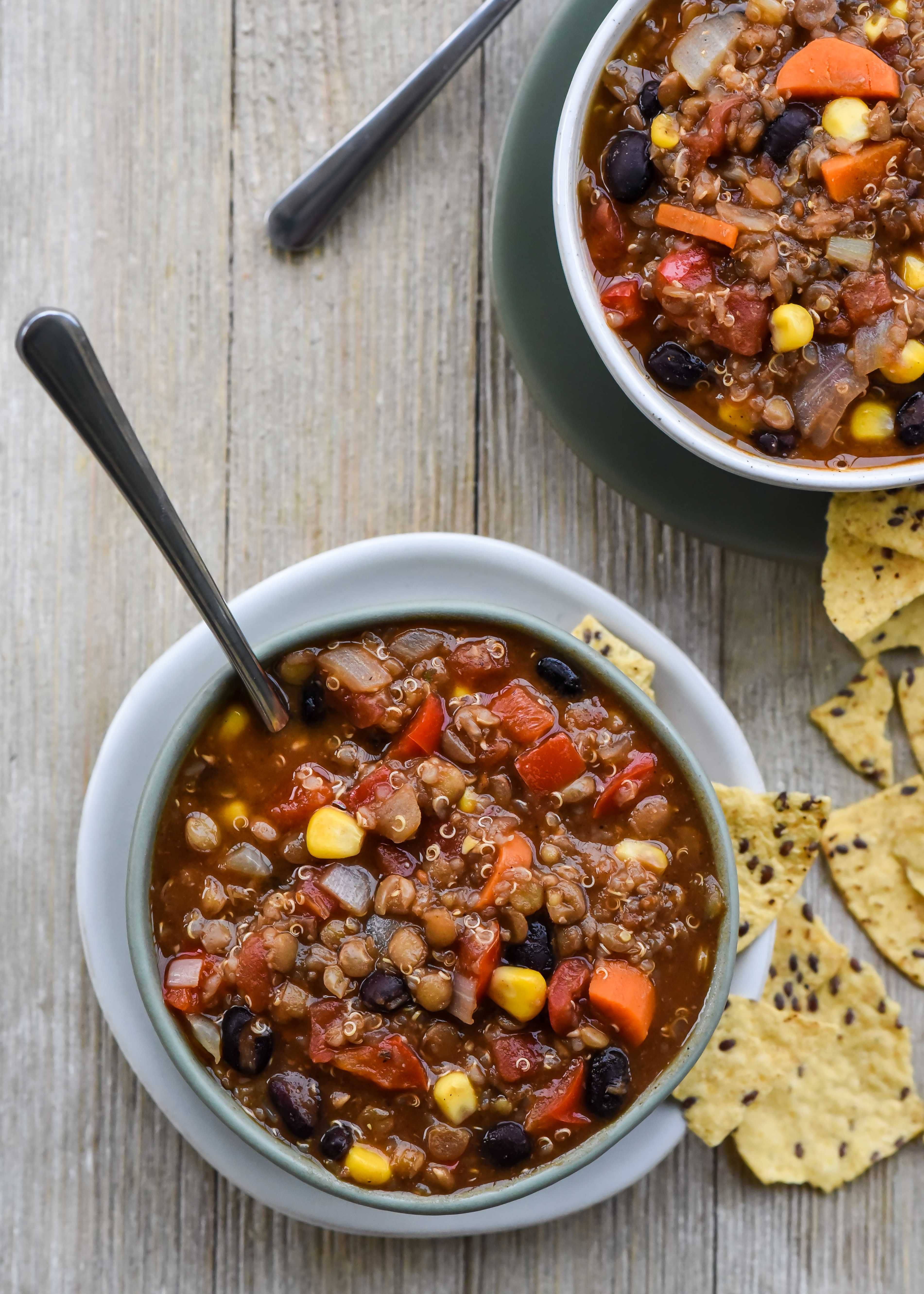 This Vegan Lentil & Quinoa Chili is made using only one pot, can be on the table in one hour & gives you the same hearty taste of chili without the meat!