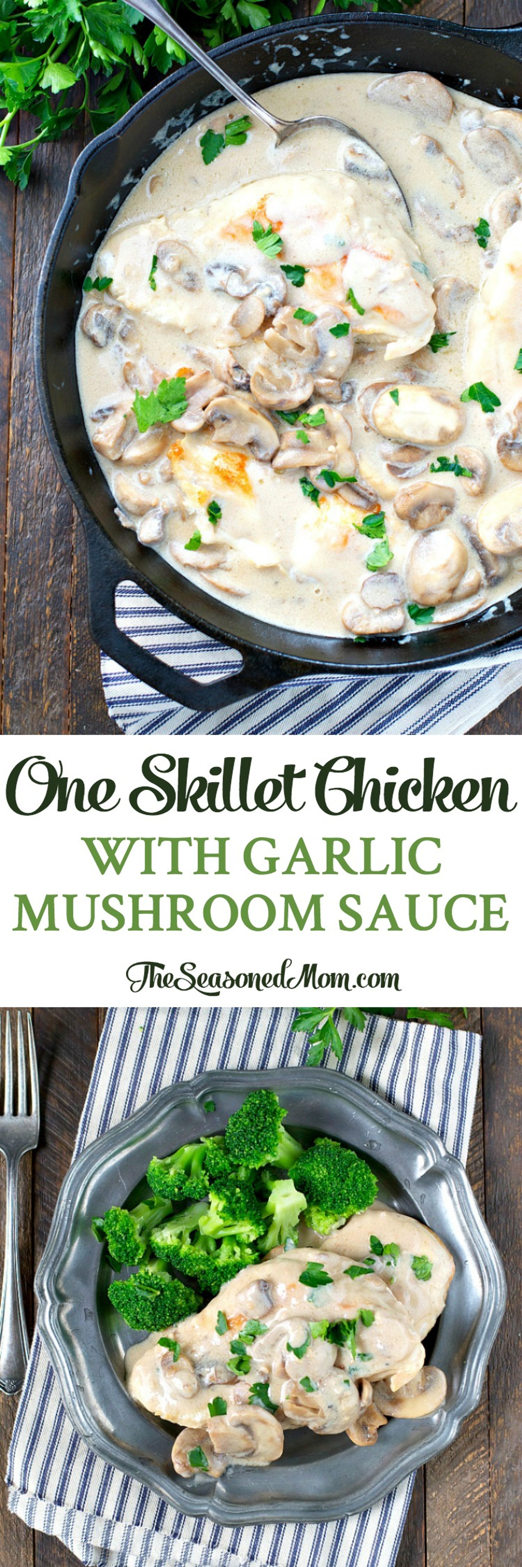 With just 5 minutes of prep, this ONE SKILLET CHICKEN WITH GARLIC MUSHROOM SAUCE is a wholesome, low carb, and easy dinner for busy weeknights!