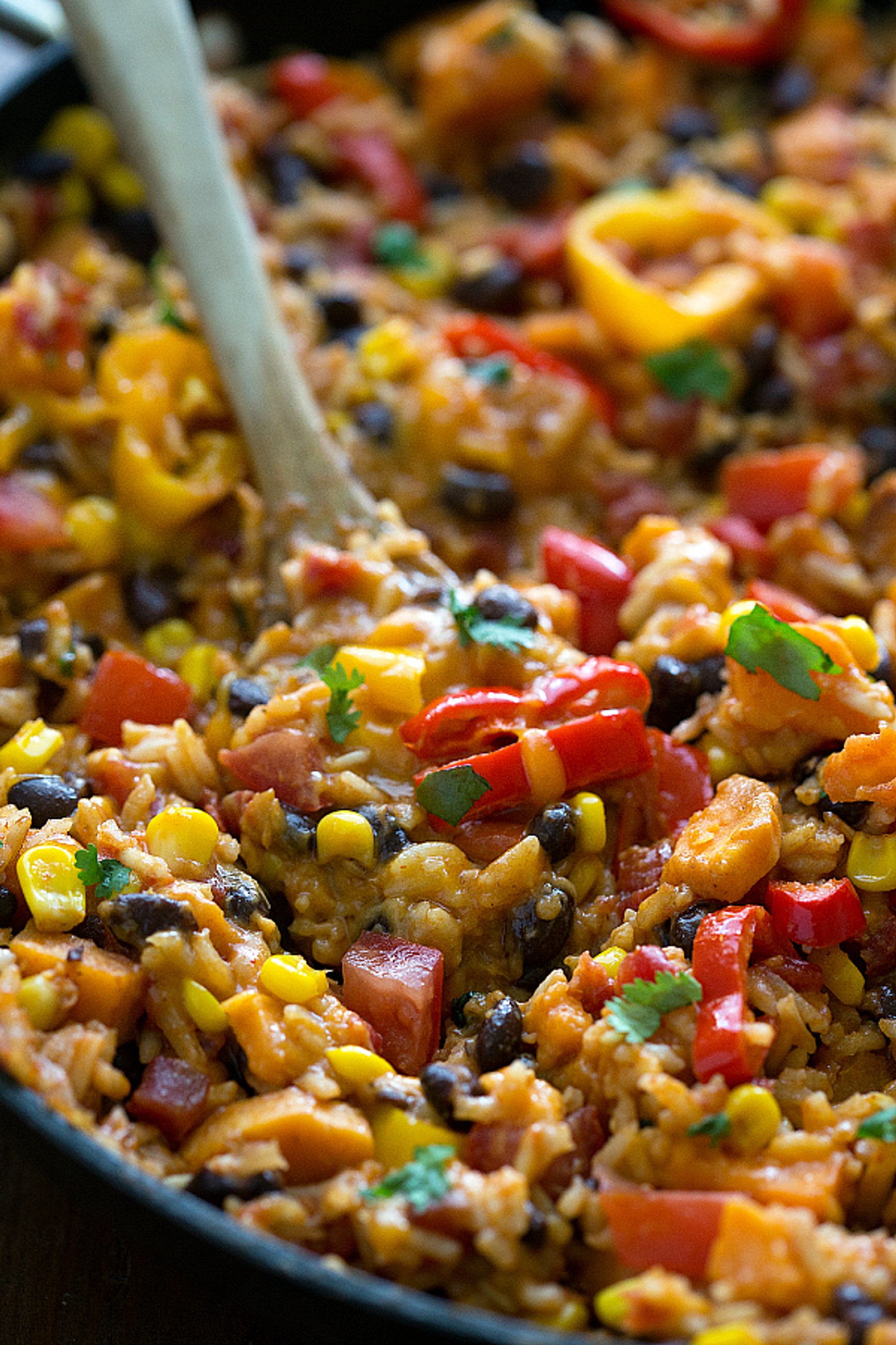 A dinner made in just one skillet – sweet potato burrito bowls. A mouth-watering vegetarian meal with sweet potatoes, rice, sweet peppers, black beans, corn, and toppings such as fresh cilantro, cheddar cheese, a fresh tomato, and sour cream.