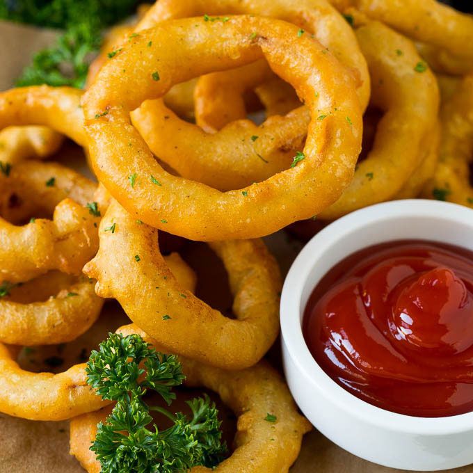 These onion rings are coated in beer batter and deep fried until golden brown. Homemade onion rings are even better than what you'd get at a restaurant, and they also happen to be fun to make!