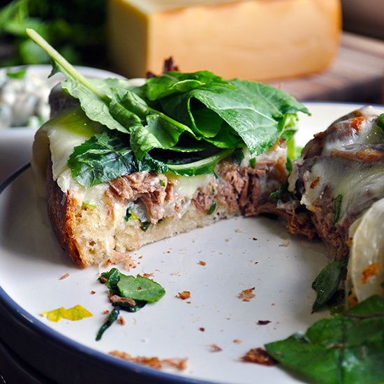 There is some serious flavor packed into these open face pot roast sandwiches. Thick slices of toast are slathered with herbed mayonnaise, stewed onions, leftover pot roast, and melted gruyere cheese, then topped with a pile of dark leafy greens. They are a delicious way to use up leftover pot roast and get dinner on the table in about 15 minutes. Get the recipe: alittleandalot.com