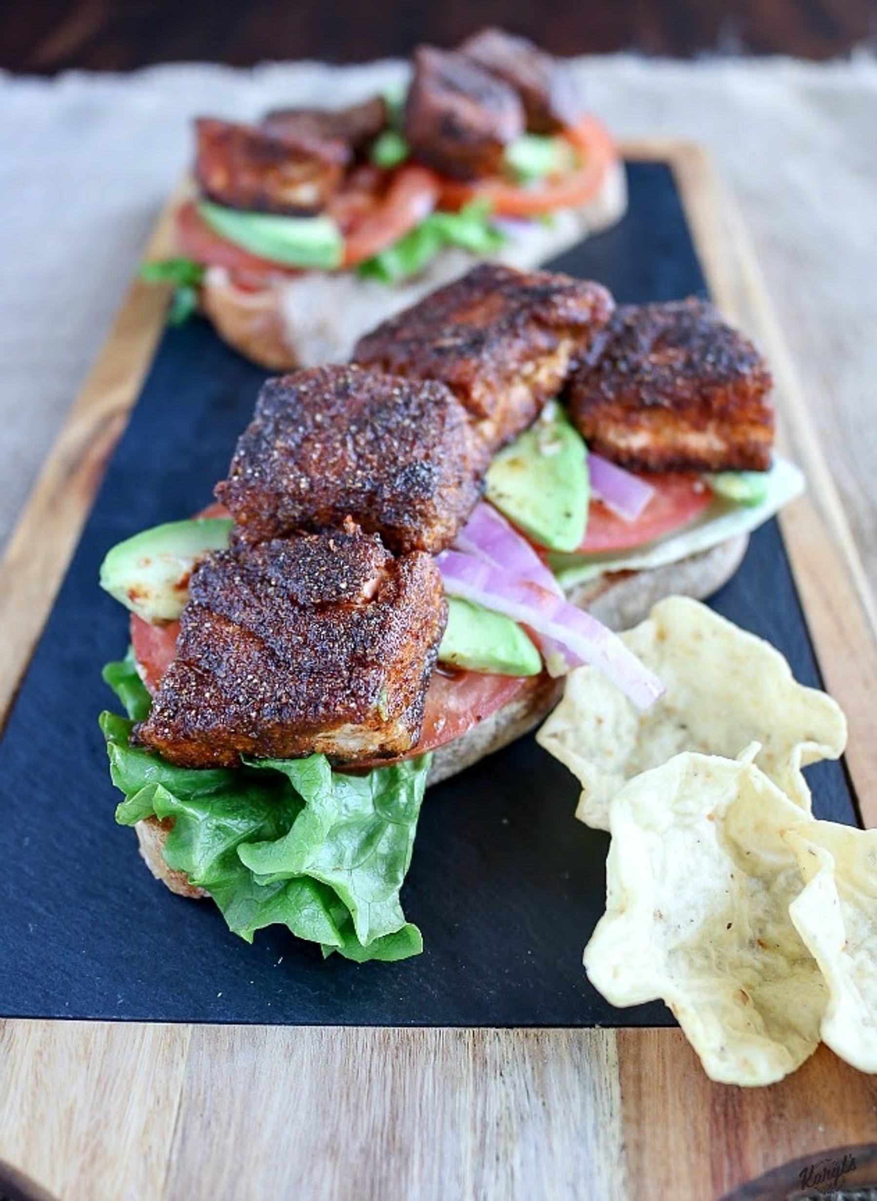 Open Faced Blackened Salmon Sandwich. Spicy salmon chunks pair perfectly with sourdough bread for a delicious sandwich. Add your favorite toppings, and finish with a drizzle of balsamic vinegar