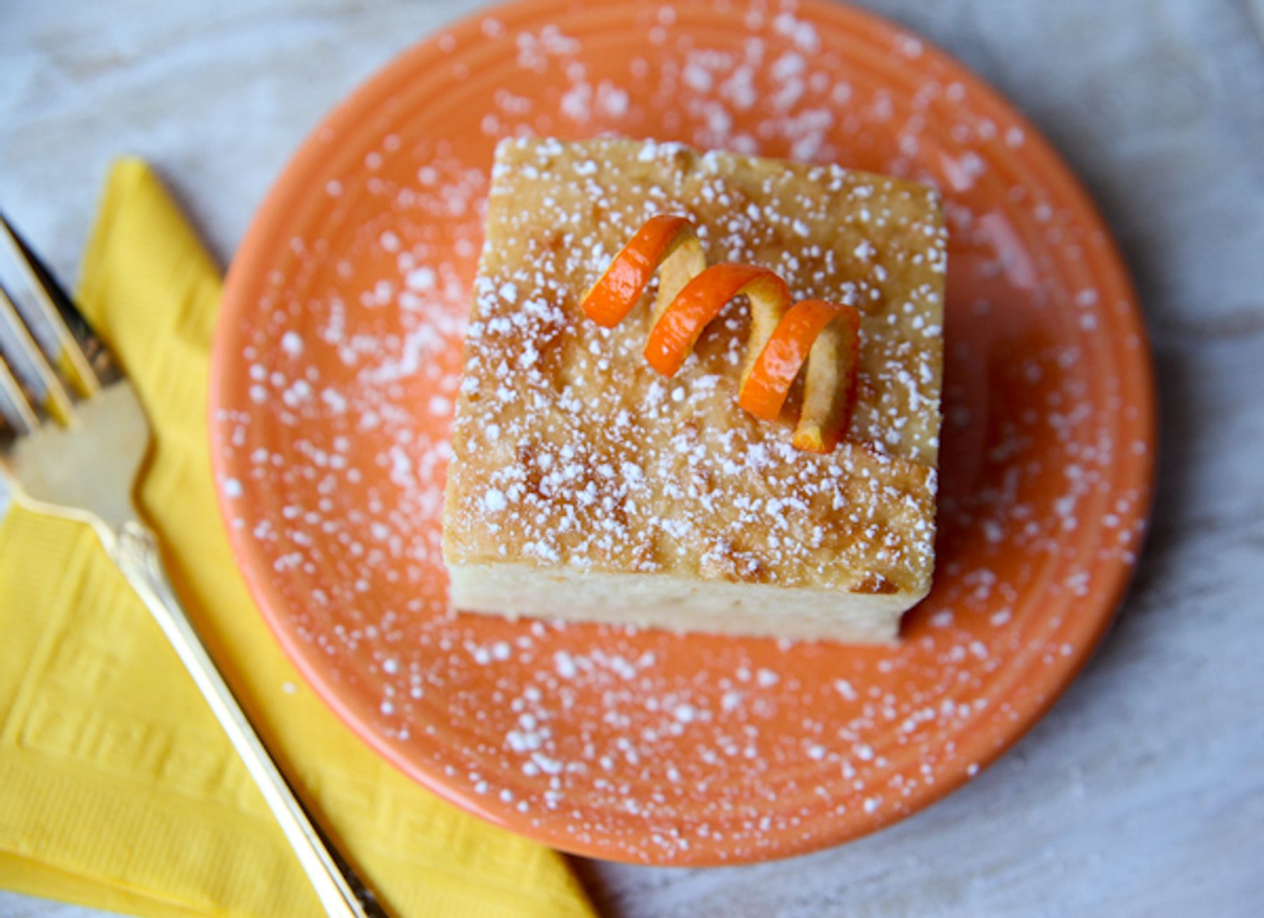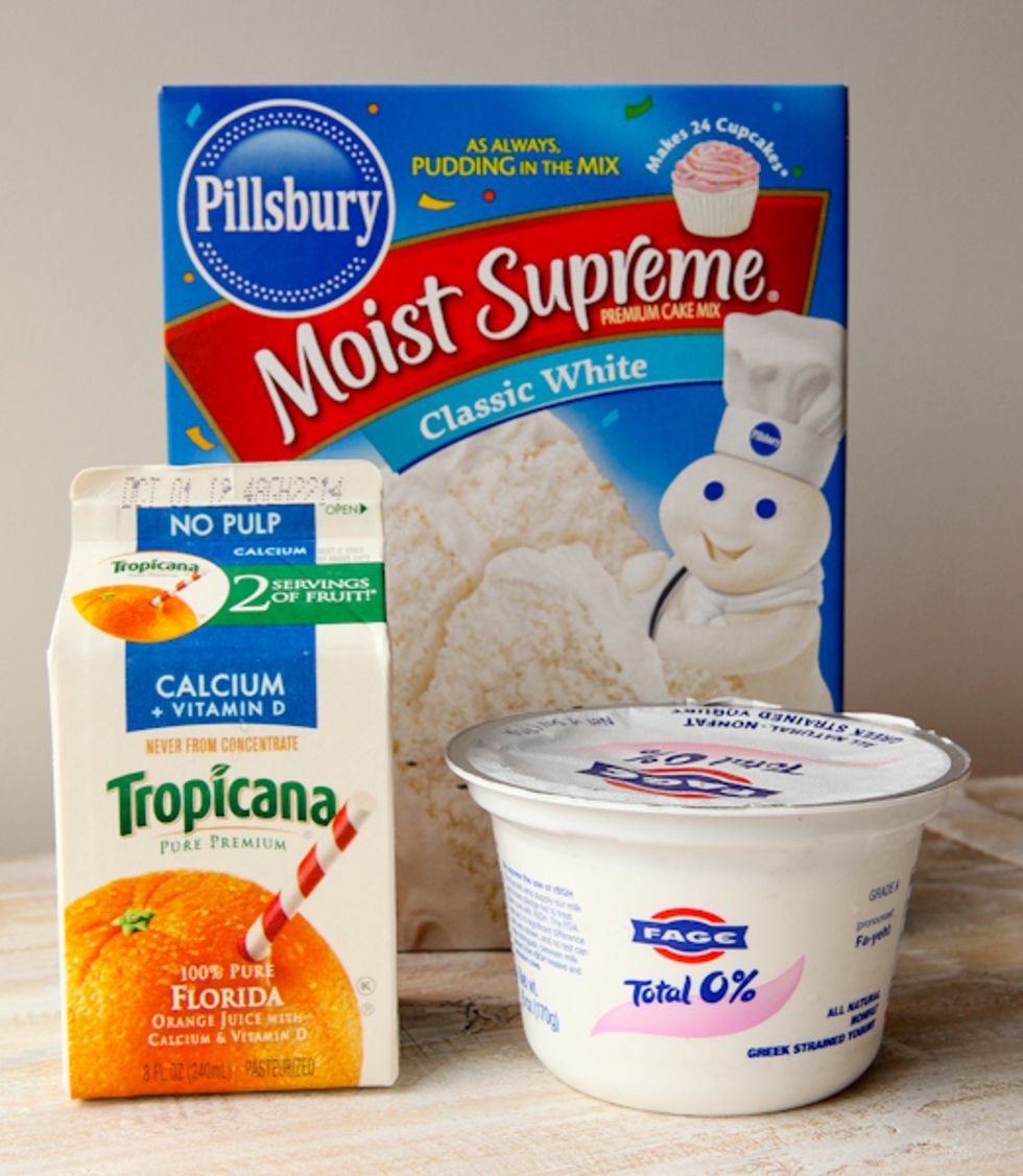 In a large mixing bowl, combine cake mix, Greek yogurt and orange juice. Include the zest of one orange, if desired. Pour batter into a greased 8 x8 inch square pan. Bake at 350 degrees for 30-33 minutes. Slice into 9 pieces. Garnish with a dusting of powdered sugar and orange peel, if desired.