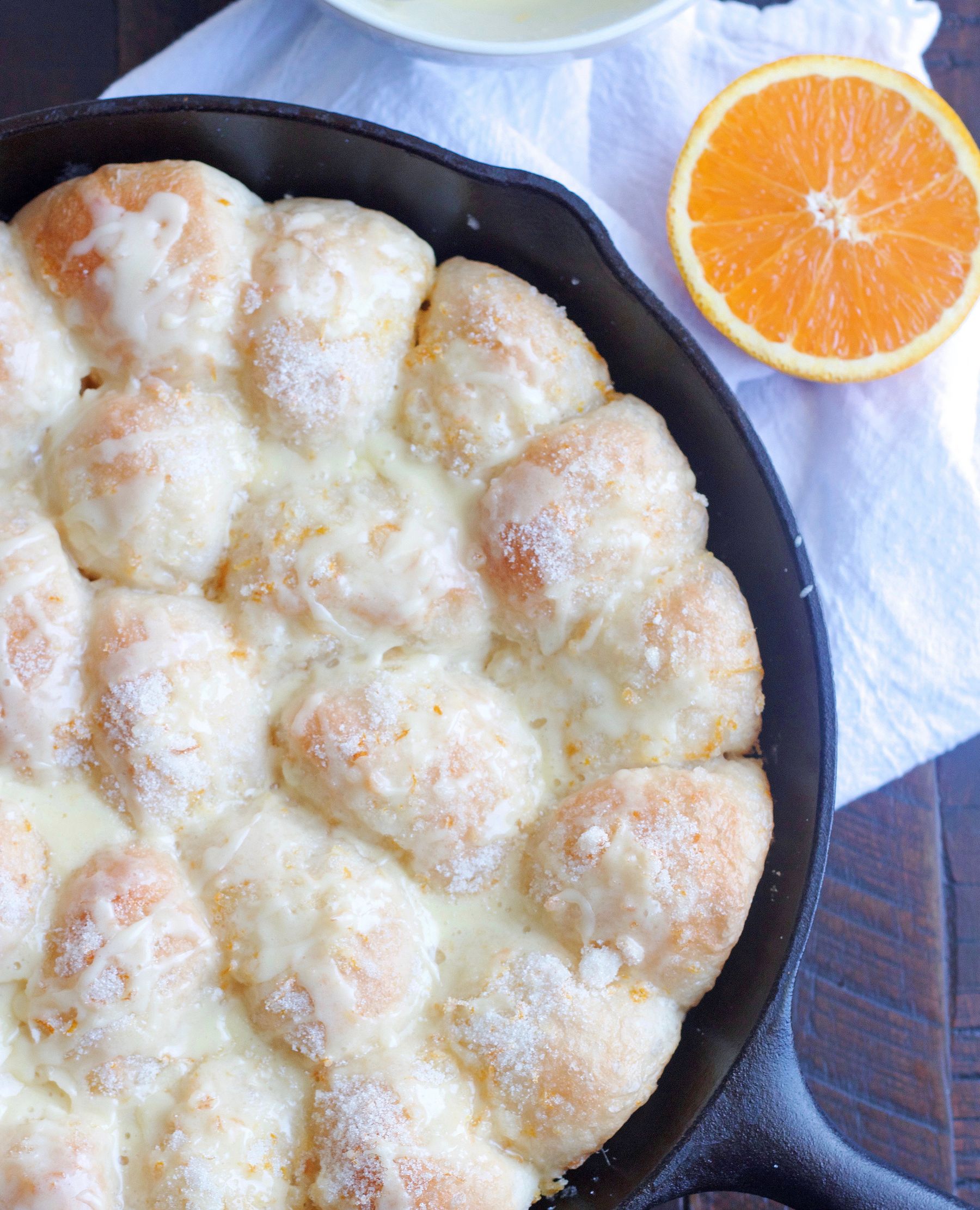 Mix orange zest with sugar and set aside. Cut rolls in half and place in a 12-inch sprayed deep dish pan or 9x13-inch sprayed baking pan. (I use my 12-inch cast iron skillet.) Drizzle ¼ cup melted butter...