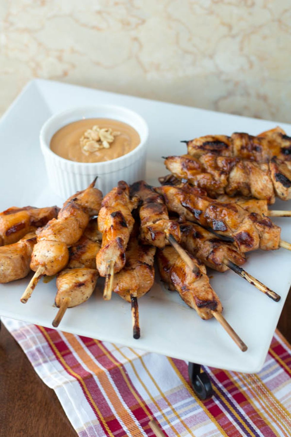 Grilled chicken skewers marinated with an orange and sriracha sauce. Tons of flavor and served with a side of peanut dipping sauce.