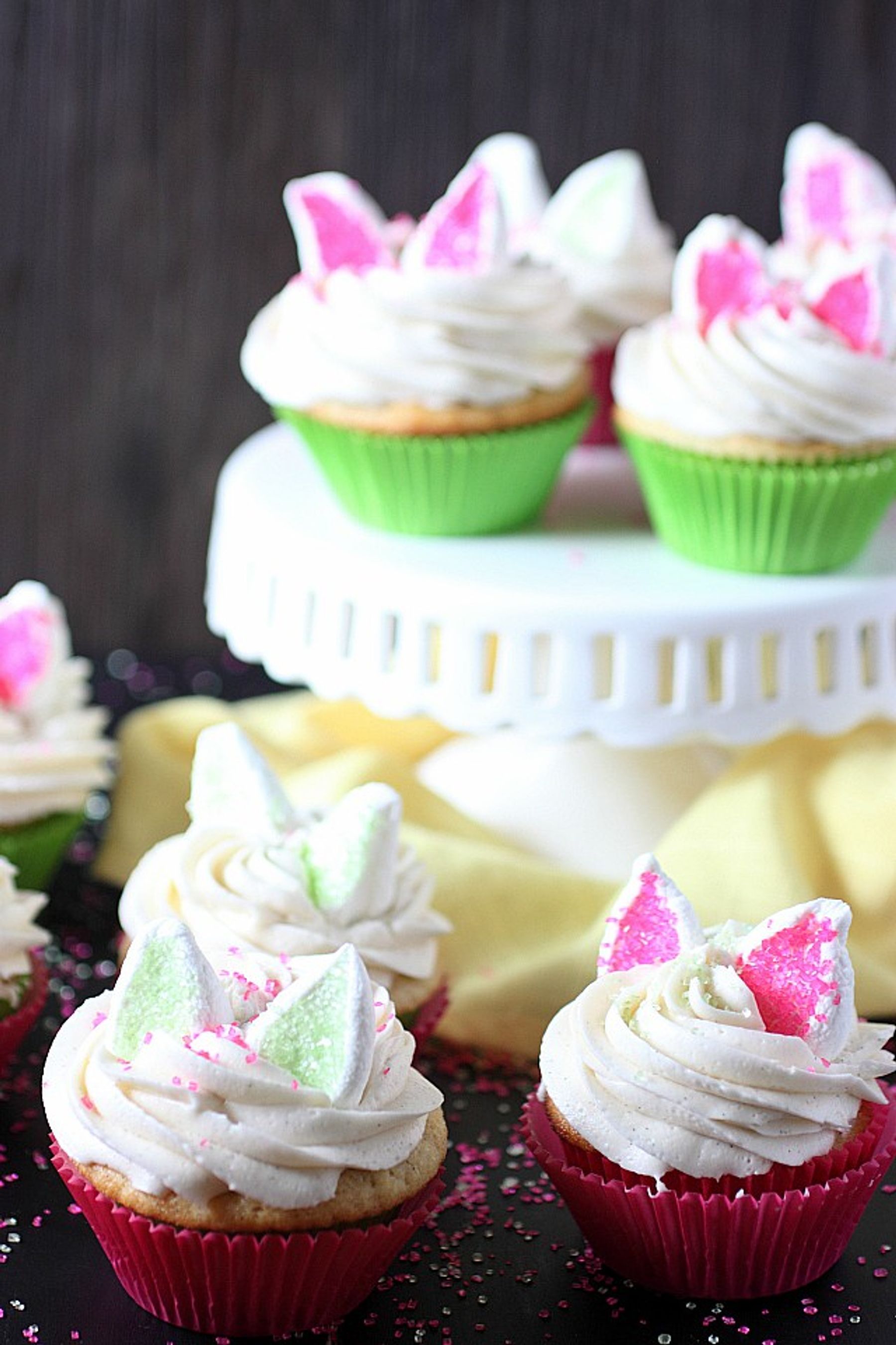 Orange vanilla bean Easter Bunny Cupcakes with a hint of citrus, piled high with a deliciously sweet frosting and topped with cute marshmallow rabbit ears (that sort of resemble kitten ears). These cupcakes are not only a fun kiddie activity, but a tasty one too!