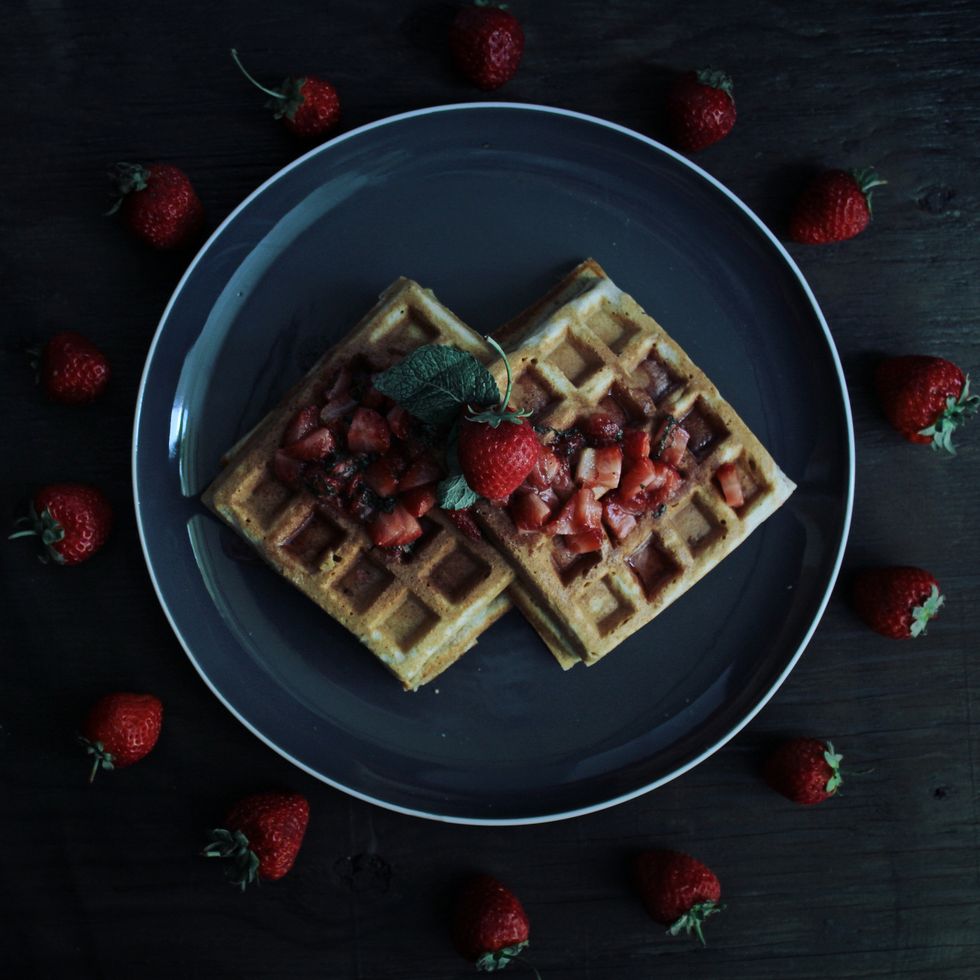Orange Zest Ricotta Waffles with Strawberry Black Pepper Compote