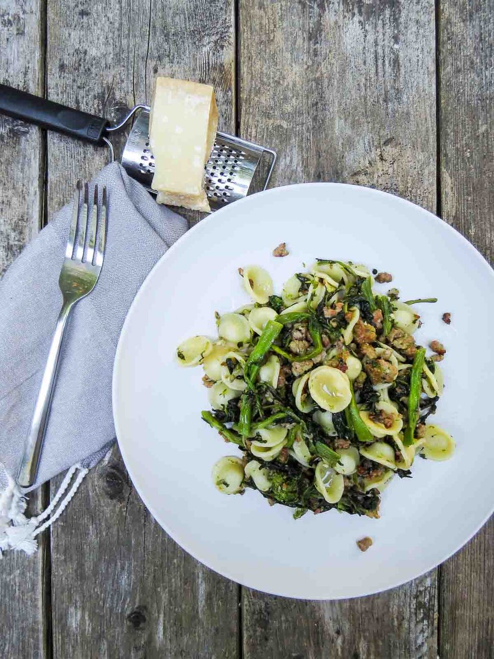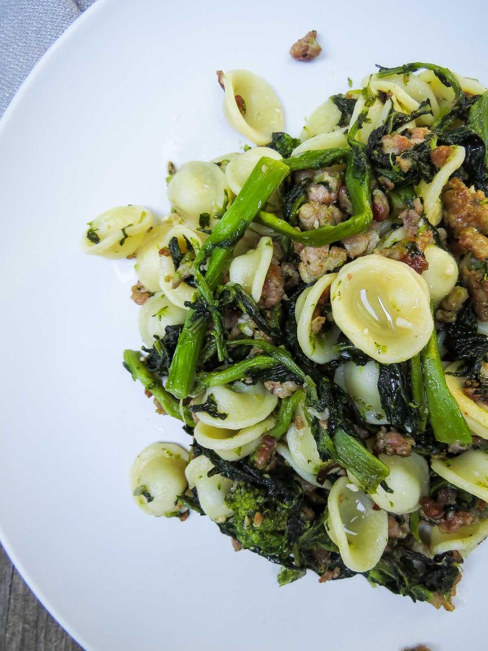 Delicious juicy Italian sausage and the slightly bitter yummy taste of rapini come together in an awesome traditional pasta dish.