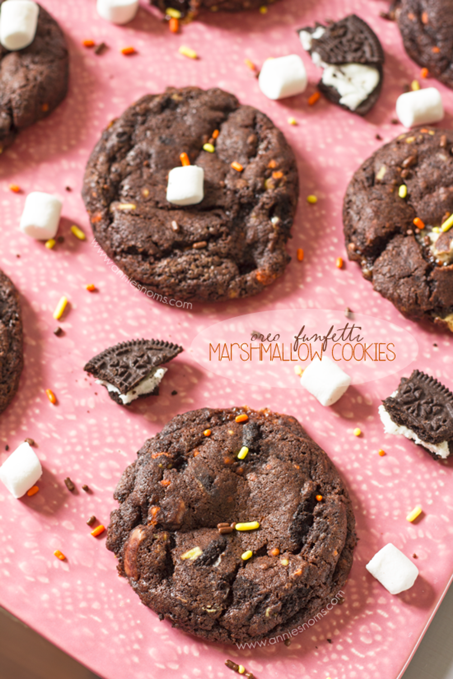 They may be a mouthful to say, but these Oreo Funfetti Marshmallow Cookies are the perfect combination of rich, crunchy biscuits, soft, chewy marshmallows, colourful funfetti and my famous cookie dough. Perfect for Halloween or just because you want cookies!