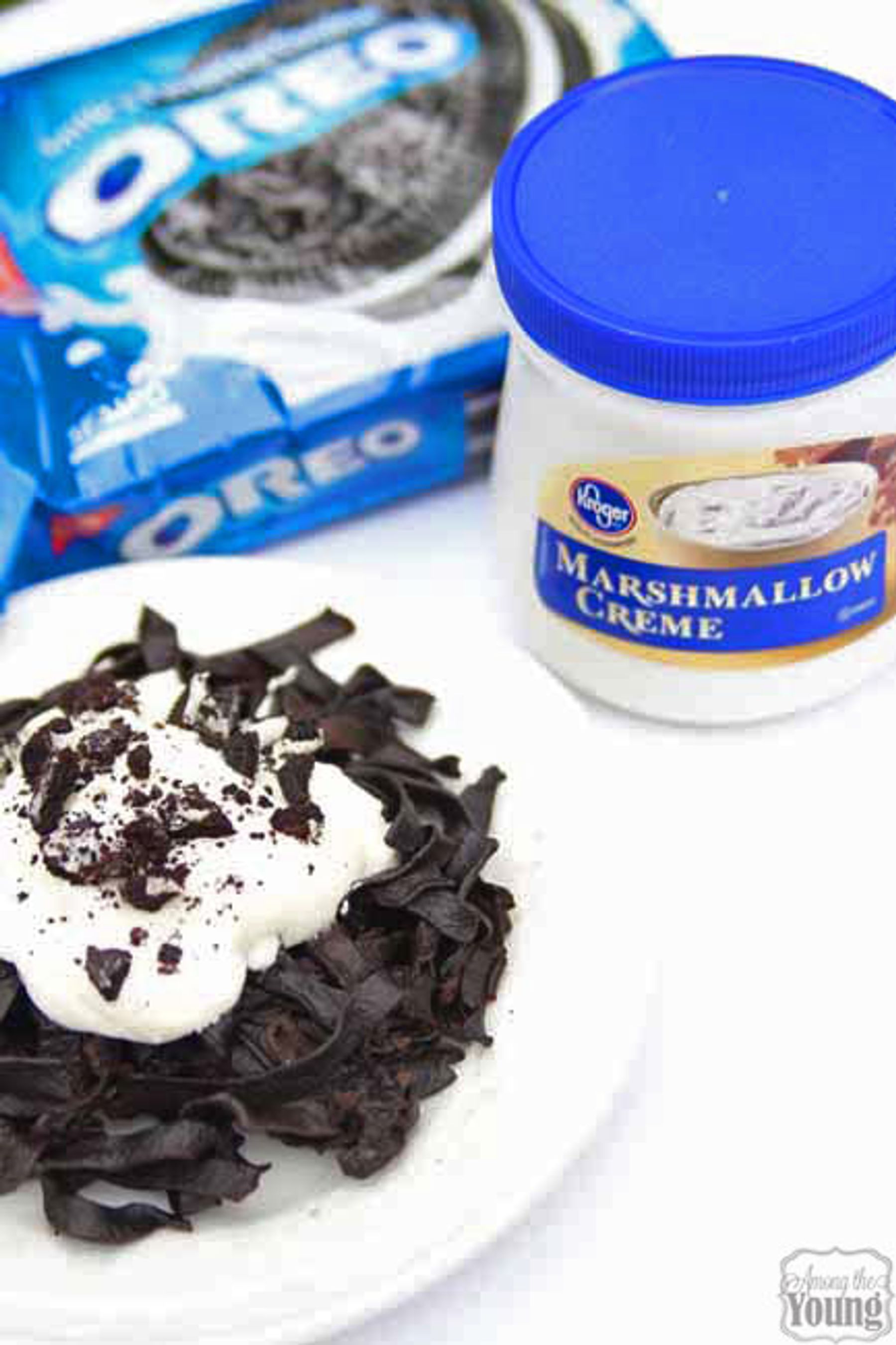 Homemade pasta mixed with Oreos and topped with a marshmallow creme sauce.