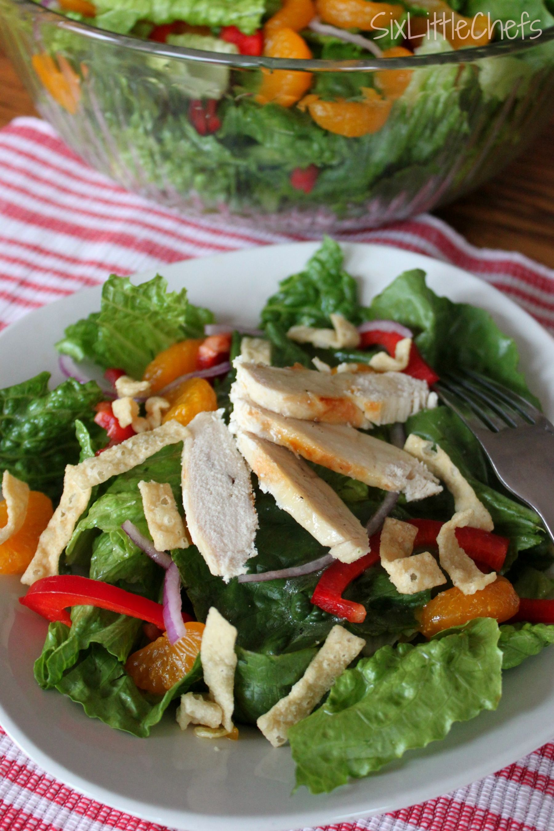 This salad is sure to become a summertime favorite! It combines yummy vegetables with a little bit of fruit and a sweet vinegar dressing. Throw in some wonton strips and caramelized almonds for a little crunch and then top it all off with some grilled chicken. Summer food at it\\\'s finest!