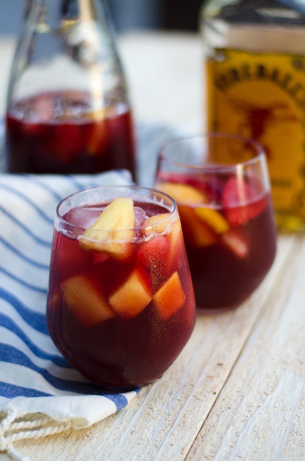 Combine the juice, whiskey and wine in a large pitcher. Add the frozen fruit and allow to chill for 10 minutes.