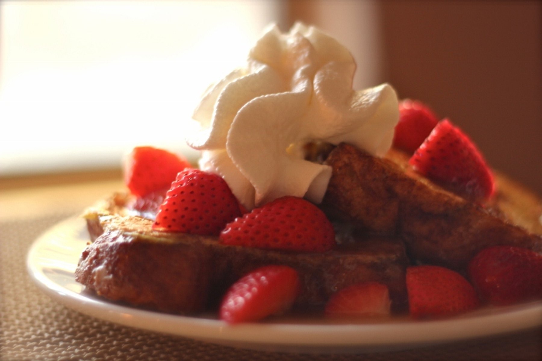 ?Serve french toast with warm caramel syrup, sliced strawberries, and whip cream or cool whip.