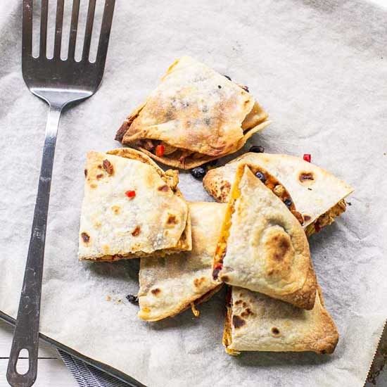 These tasty oven baked chicken quesadillas are super easy to prepare for lunch or afternoon snack. They are stuffed with chicken, red and yellow bell peppers, onion, black beans and grated cheese.