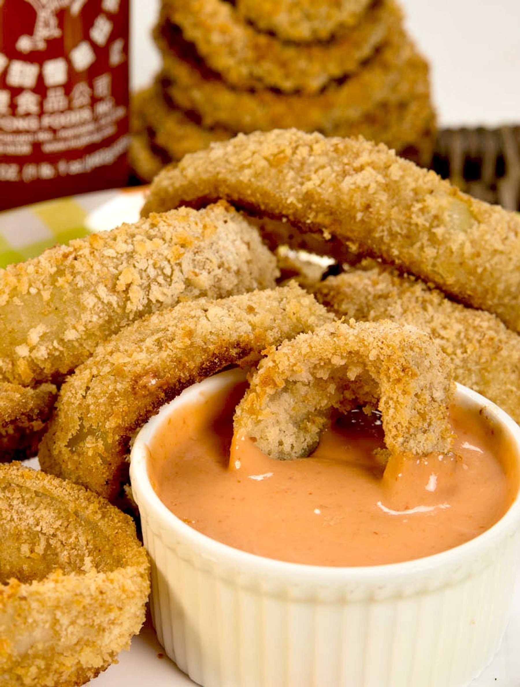 OVEN BAKED ONION RINGS. Oven Baked Onion Rings are so simple to make, they can be done in 3 EASY STEPS: shake, dunk, and dip. There is just something about the smell of Onion Rings that immediately makes your mouth water. I have to say these Oven Baked Onion Rings did just that.