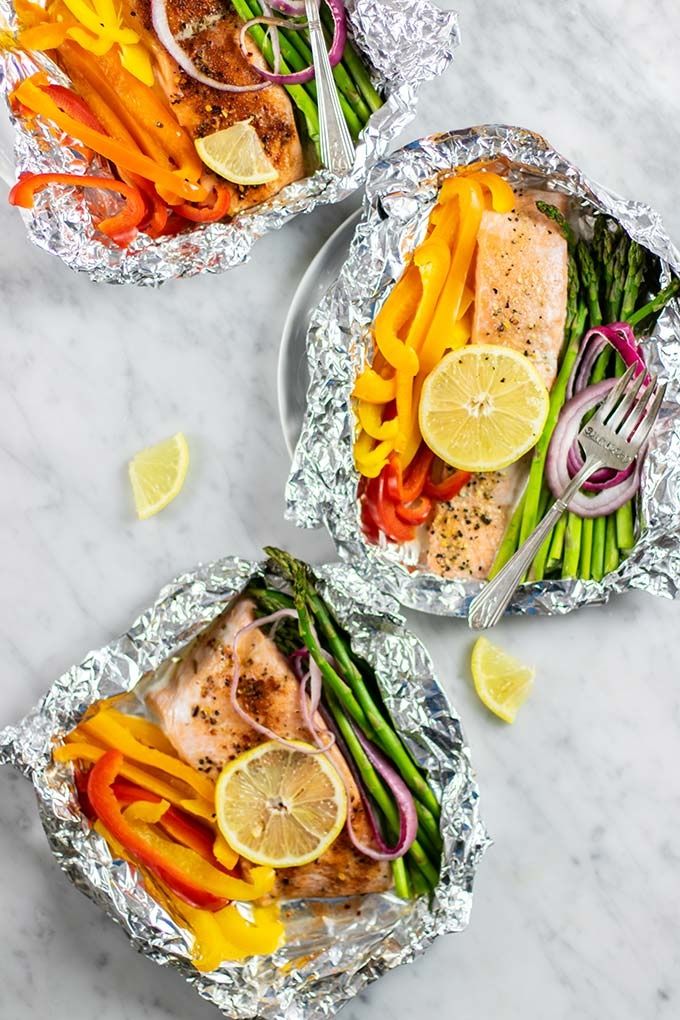 - Lay out a large piece of foil. Add a fillet of salmon in the center, and surround with chopped veggies. Season to taste with your choice of seasonings, and...